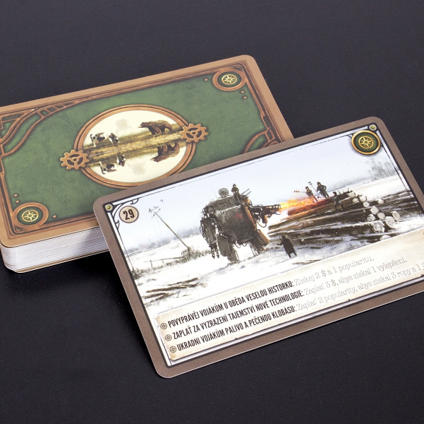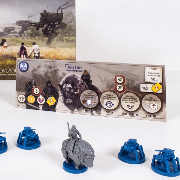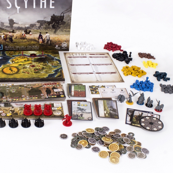 Hra obsahuje: herní plán, 5 dvouvrstvých desek hráče, 23 karet úkolů, 28 karet Setkání, 42 bojových karet, 12 karet Továrny, 5 karet nápovědy k Brodění, 5 kartiček rychlé nápovědy, 80 žetonů surovin (20 od každého typu: jídlo, kov, dřevo a ropa), 80 mincí (různé hodnoty), 2 bojové ukazatele, 12 násobících žetonů, 12 žetonů setkání, 6 dílků stavebních bonusů, komponenty frakce - 5 desek frakce, 5 figurek akce, 5 žetonů popularity, 5 žetonů moci, 30 žetonů hvězd, 20 dřevených budov, 20 figurek rekrutů, 20 miniatur mechů, 5 miniatur postav, 40 figurek dělníků, 30 kostek technologií, list rychlé nápovědy a pravidla.