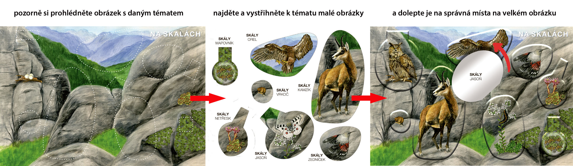 Novinka pro začátečníky: děti nejprve vystřihnou jednotlivé dílky skládačky a pak je nalepují do natištěných velkých obrázků. Orientují se podle barevné předlohy, která je součástí sešitu a podle názvů rostlin a živočichů, která jsou natištěna na zadní straně jednotlivých dílů skládačky.