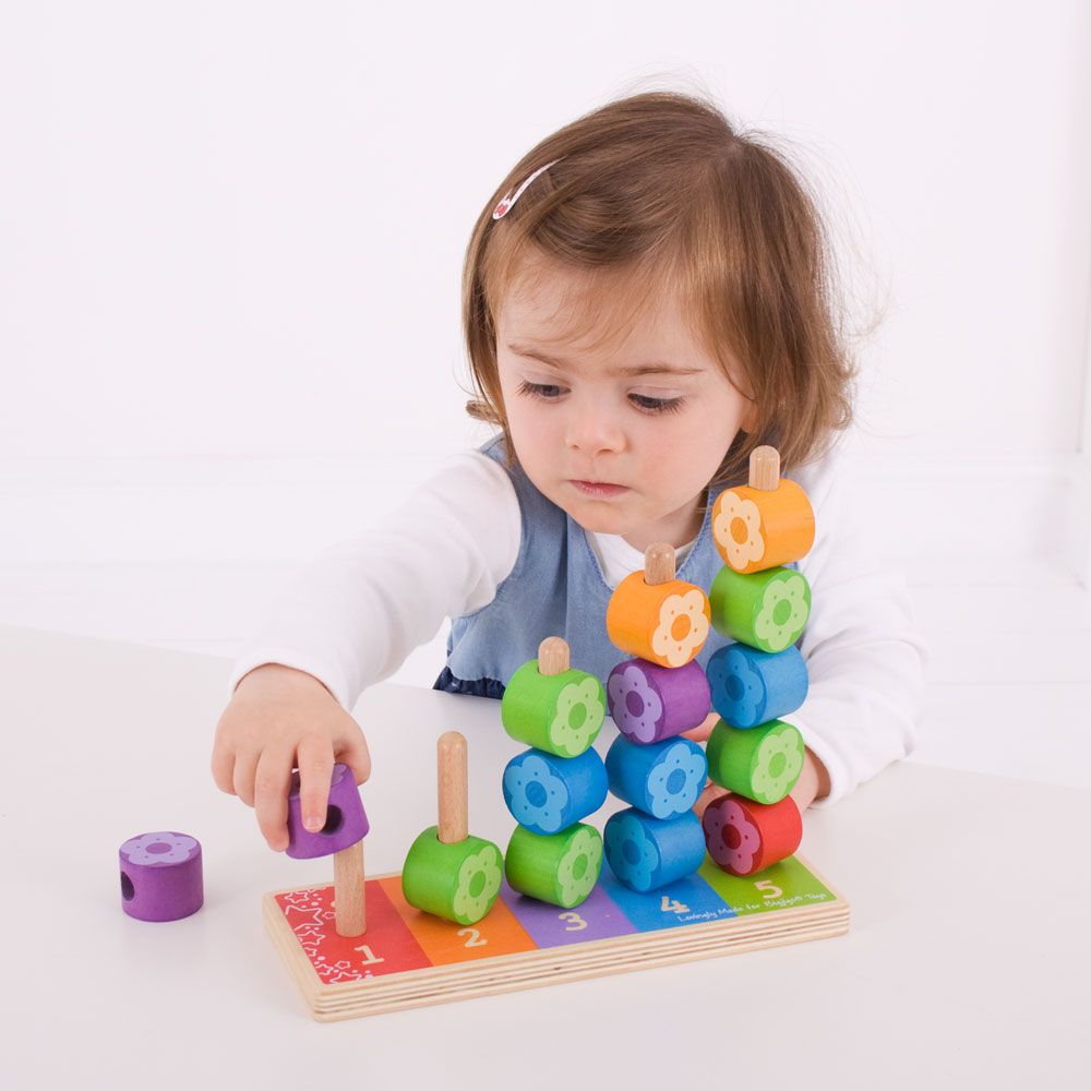 Vzdělávací dřevěné nasazování barevných květinek pomůže dítěti naučit se hravou formou rozlišovat barvy, počítat a procvičovat jemnou motoriku. Barevné květinky se nazazují na příslušné kolíky.