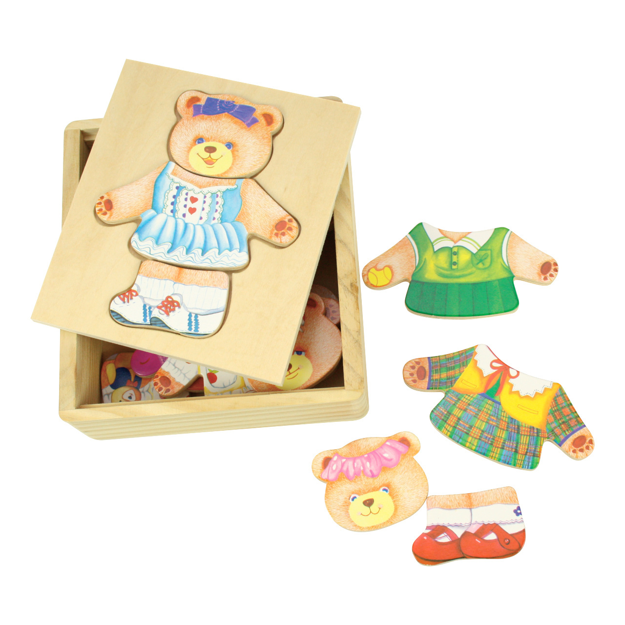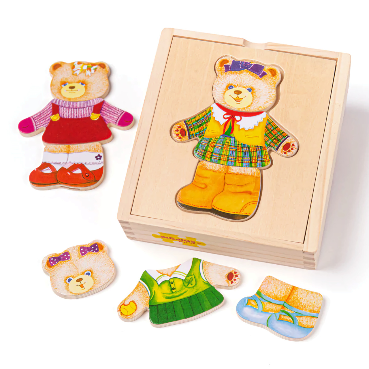 Dřevěné oblékací puzzle obsahuje celou řadu pestrobarevných dřevěných dílků, včetně oblečení a obličejů medvědice s různými výrazy. Jednotlivé díly se skládají na destičku, která zároveň slouží jako víko krabičky. Praktická krabička k uložení všech dílků puzzle. Rozvíjí schopnosti třídění a posiluje každodenní slovní zásobu. Pomáhá rozvíjet zručnost a koordinaci. Vyrobeno z vysoce kvalitních a zodpovědně zpracovaných materiálů. Vyhovuje současným evropským bezpečnostním normám.
