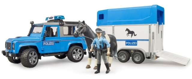 I v Bruder světě je potřeba dohlížet na dodržování zákonů a to zajistí např. sada Bruder 02588 Policejní Land Rover s přepravníkem na koně, policistou a figurkou koně.