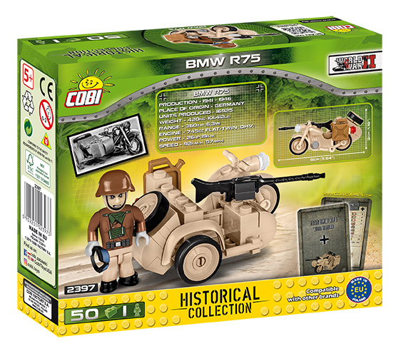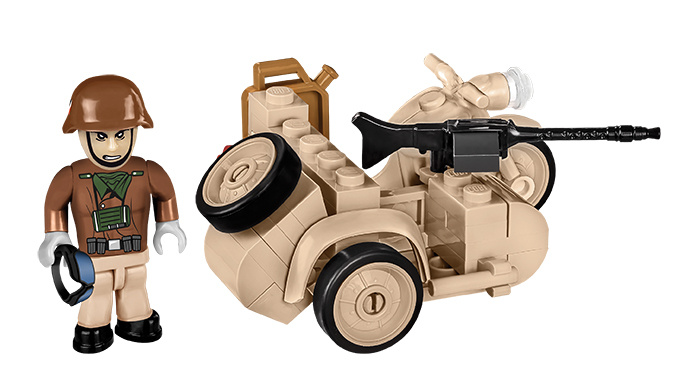 Postavte si model legendárního německého motocyklu z období 2. světové války v barvách Deutsches Afrikakorps! Sestavené vozidlo měří 9 cm na délku a 3 cm na výšku. Model má pohyblivá kola s gumovými pneumatikami, součástí je i kulomet MG 34, rezervní kolo a kanystr. Stavebnice obsahuje 50 kostek, figurku německého vojáka v tropické uniformě s odnímatelnými gumovými brýlemi a jako bonus sběratelskou kartu.