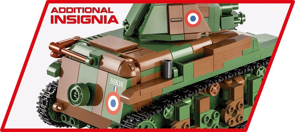 Postavte si model lehkého pěchotního tanku Renault R35. Stavebnice obsahuje 540 dílků a figurku velitele tanku vyzbrojeného pistolí. Sestavený model má mnoho pohyblivých částí jako například otočnou věž, otevírací poklop či funkční podvozek. Model má rozměry 17 cm na délku, 8,5 cm na výšku a 8,5 cm na šířku. Tank lze postavit ve francouzském nebo polském označení