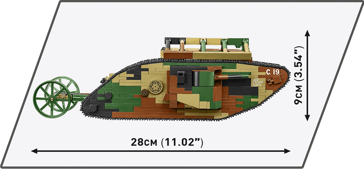 Postavte si model britského tanku MARK I ve verzi Male. Stavebnice se skládá z 878 kostiček. Tank je vyveden v polní kamufláži s označením C.19. Sestavený model má natáčecí dělové věže s nastavitelným náměrem kanónů. Pásy tanku jsou funkční a s modelem lze snadno pojíždět po neklouzavém povrchu. Součástí balení je také figurka řidiče-mechanika a kostka s popisem.