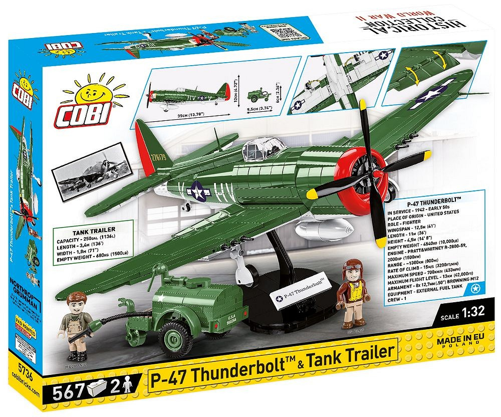 Postavte si model amerického stíhacího letadla Republic P-47 Thunderbolt v měřítku 1:32. Sestavený model se skládá ze 477 dílků a měří 35 cm na délku, 12 cm na výšku a má rozpětí křídel 40 cm. Letadlo má mnoho pohyblivých prvků jako jsou otočná kola s gumovými pneumatikami, zatahovací podvozek, otočná vrtule a pohyblivé klapky. V otevíratelné kabině můžete umístit figurku pilota, která je součástí sady. Model může stát na vlastním podvozku nebo být v letové poloze na přiloženém stojánku. Sada Executive Edition byla obohacena o přívěs s palivovou cisternou a figurku mechanika.