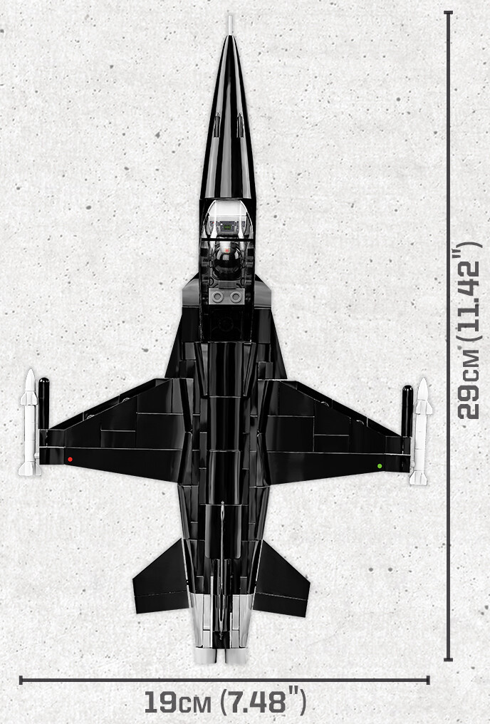 Postavte si model letounu Northrop F-5A Freedom Fighter v černé kamufláži z legendárního prvního filmu Top Gun, znázorňujícího nepřátelský MIG-28 v měřítku 1:48. Sestavený model se skládá z 332 dílků a měří 29 cm na délku, 19 cm na šířku a 9 cm na výšku. Letoun má pohyblivá křidélka, výzbroj a odnímatelný podvozek. Kabina pilota je odnímatelná a lze do ní umístit zjednodušenou figurku s přilbou s charakteristickou červenou filmovou hvězdou uzavřenou ve žlutém kruhu! Sada obsahuje letový stojánek s logem Top Gun.