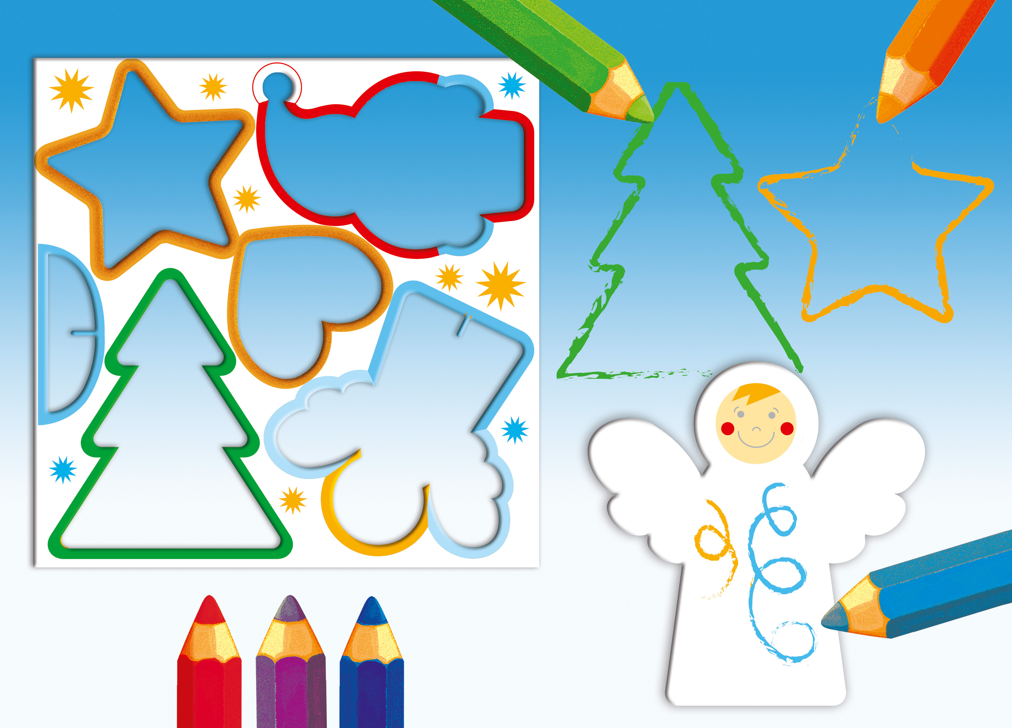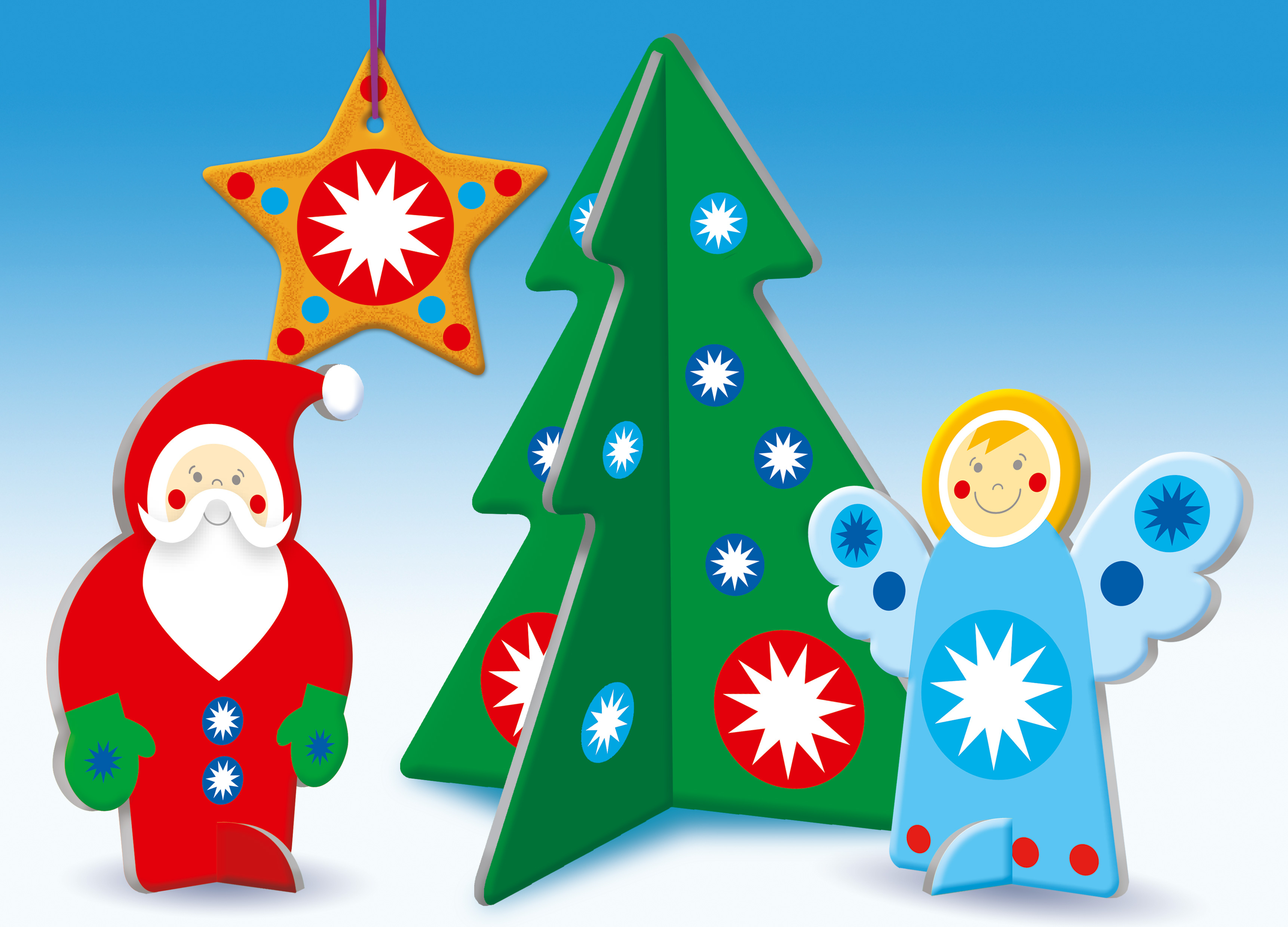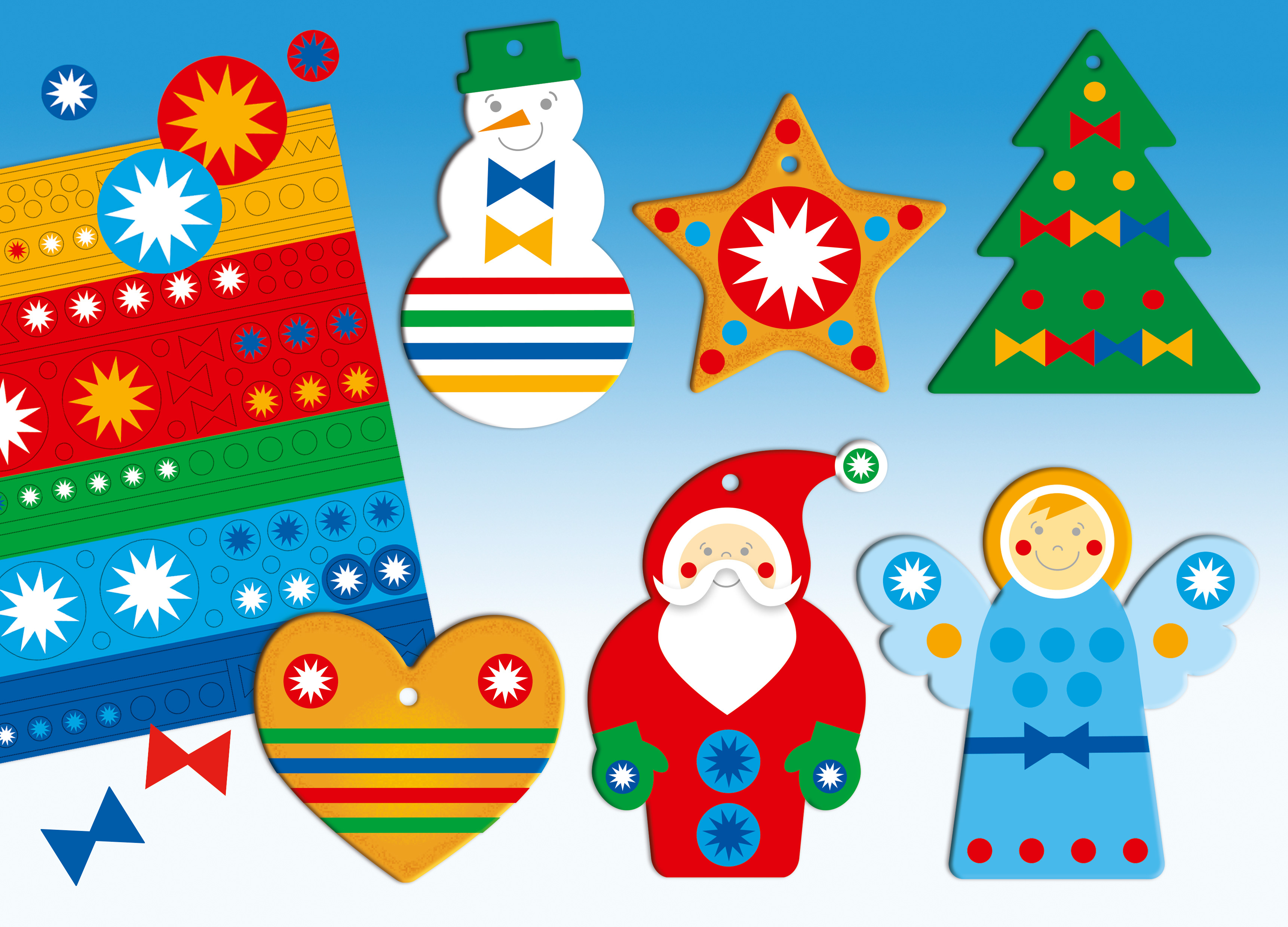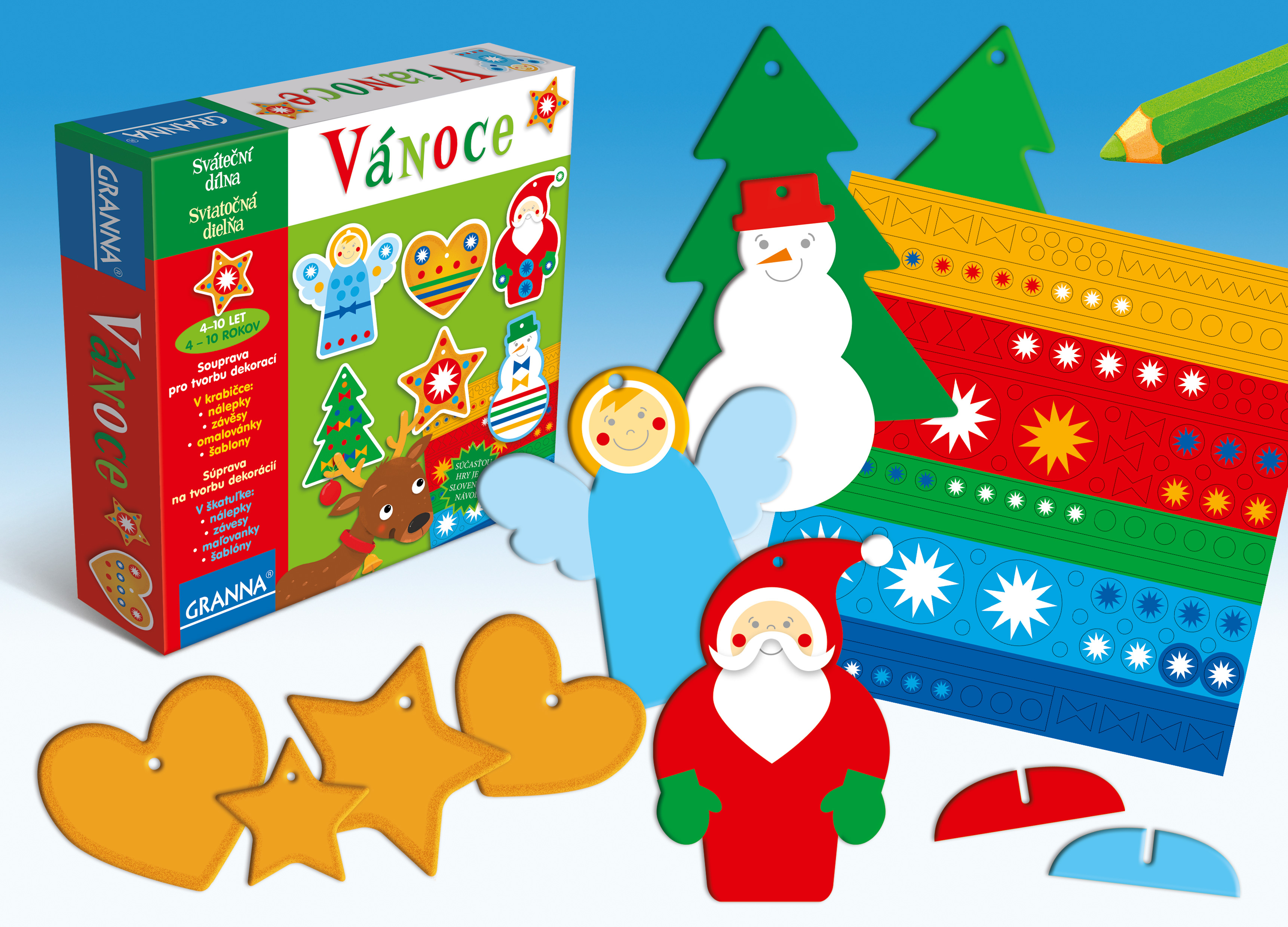 Tematicky zaměřená kreativní souprava, díky které si děti mohou vytvořit nádherné dekorativní vánoční ozdoby. Mikulášové, sněhuláci, andílci, perníčky a stromečky v několika velikostech čekají na čtyřech arších ze silného, pevného kartonu. Z jedné strany jsou tyto motivy barevné a k jejich ozdobení slouží přiložený aršík barevných nálepek různých tvarů. Z druhé strany jsou všechny tvary bílé a poskytují dětem prostor pro tvořivou práci s pastelkami, fixy apod., a to jak podle přiložených vzorů, tak na základě vlastní fantazie. Některé dekorace je možné díky přiloženým stojánkům postavit, jiné zavěsit (šňůrky nejsou součástí balení). Po vytlačení jednotlivých motivů z archů umožňuje sada i další využití – všechny čtyři archy lze použít jako šablony, s jejichž pomocí si děti mohou všechny motivy překreslovat na libovolný podklad a vytvářet tak nekonečné množství vlastních ozdob s nejrůznějším dekorem.
