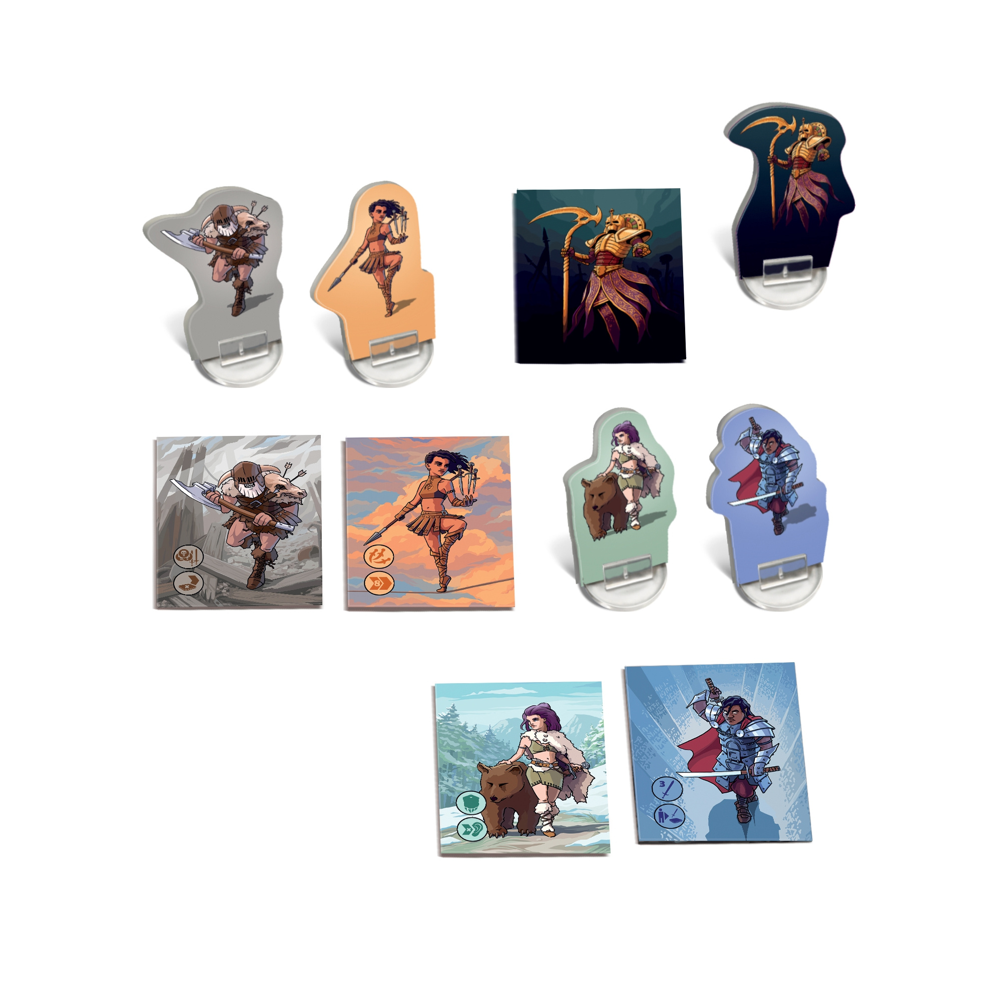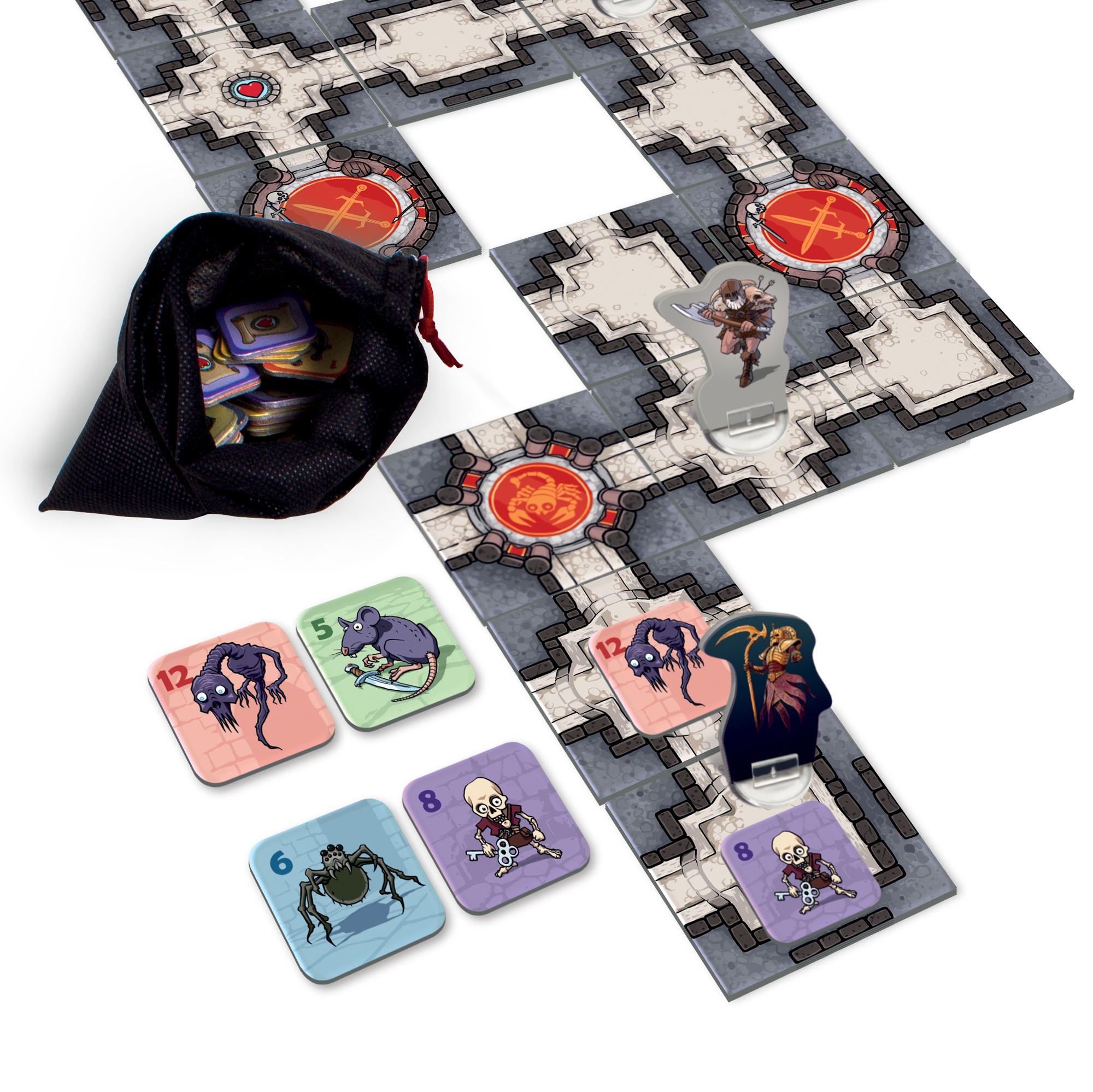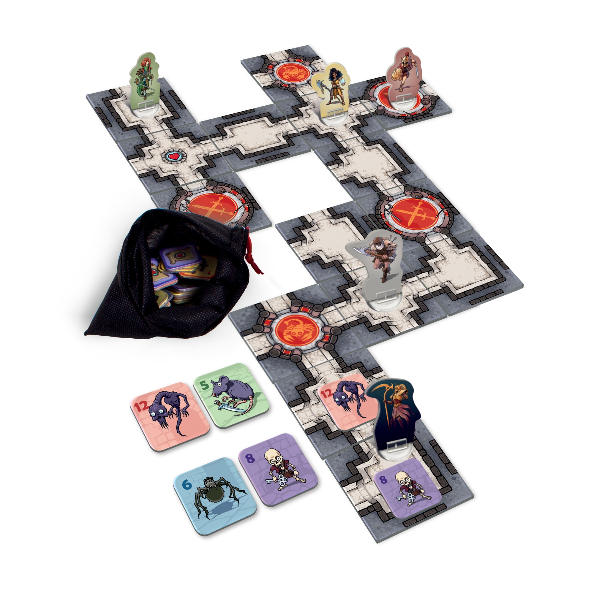 Hra Karak - Regent obsahuje: 18 destiček katakomb, 5 karet hrdinů, 5 figurek hrdinů, 5 stojánků, 8 žetonů nestvůr a pravidla.