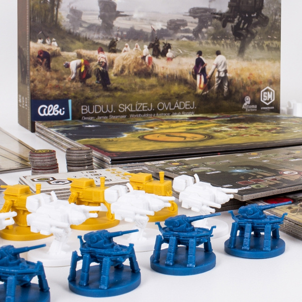 Hra obsahuje: herní plán, 5 dvouvrstvých desek hráče, 23 karet úkolů, 28 karet Setkání, 42 bojových karet, 12 karet Továrny, 5 karet nápovědy k Brodění, 5 kartiček rychlé nápovědy, 80 žetonů surovin (20 od každého typu: jídlo, kov, dřevo a ropa), 80 mincí (různé hodnoty), 2 bojové ukazatele, 12 násobících žetonů, 12 žetonů setkání, 6 dílků stavebních bonusů, komponenty frakce - 5 desek frakce, 5 figurek akce, 5 žetonů popularity, 5 žetonů moci, 30 žetonů hvězd, 20 dřevených budov, 20 figurek rekrutů, 20 miniatur mechů, 5 miniatur postav, 40 figurek dělníků, 30 kostek technologií, list rychlé nápovědy a pravidla.