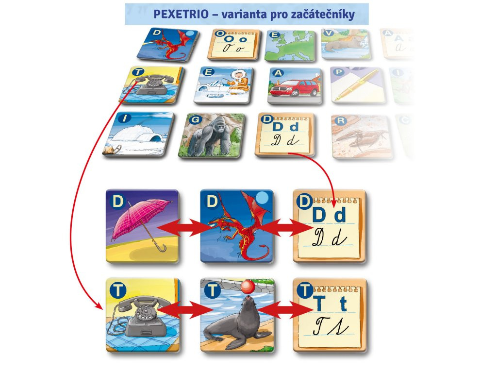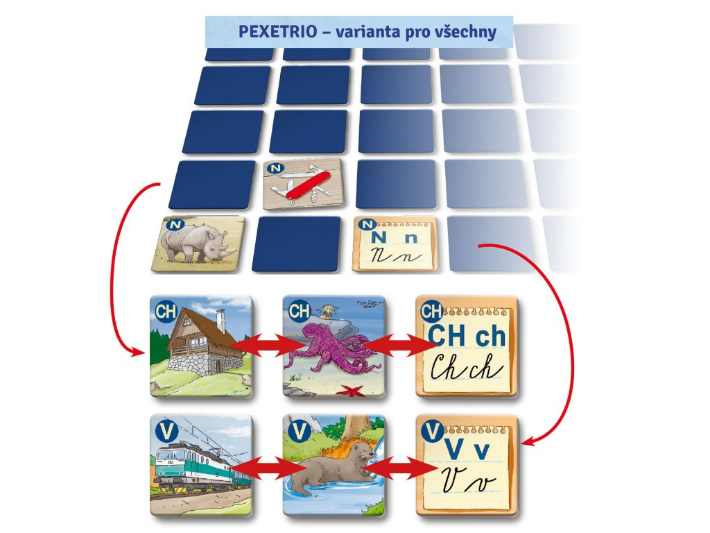 Například ve hře Řekni slovo! si hráči procvičují slovní zásobu. Ve hře ABECEDA se hráči učí řadit písmenka ve správném pořadí, aby v budoucnu mohli znalost využívat při orientaci v různých seznamech a encyklopediích. Hru Šibenici asi není třeba představovat. Dále tu najdete Pexetrio (= pexeso se 3 kartičkami) či hru LOTO-TRIO a další varianty deskovky značky Pexetrio.