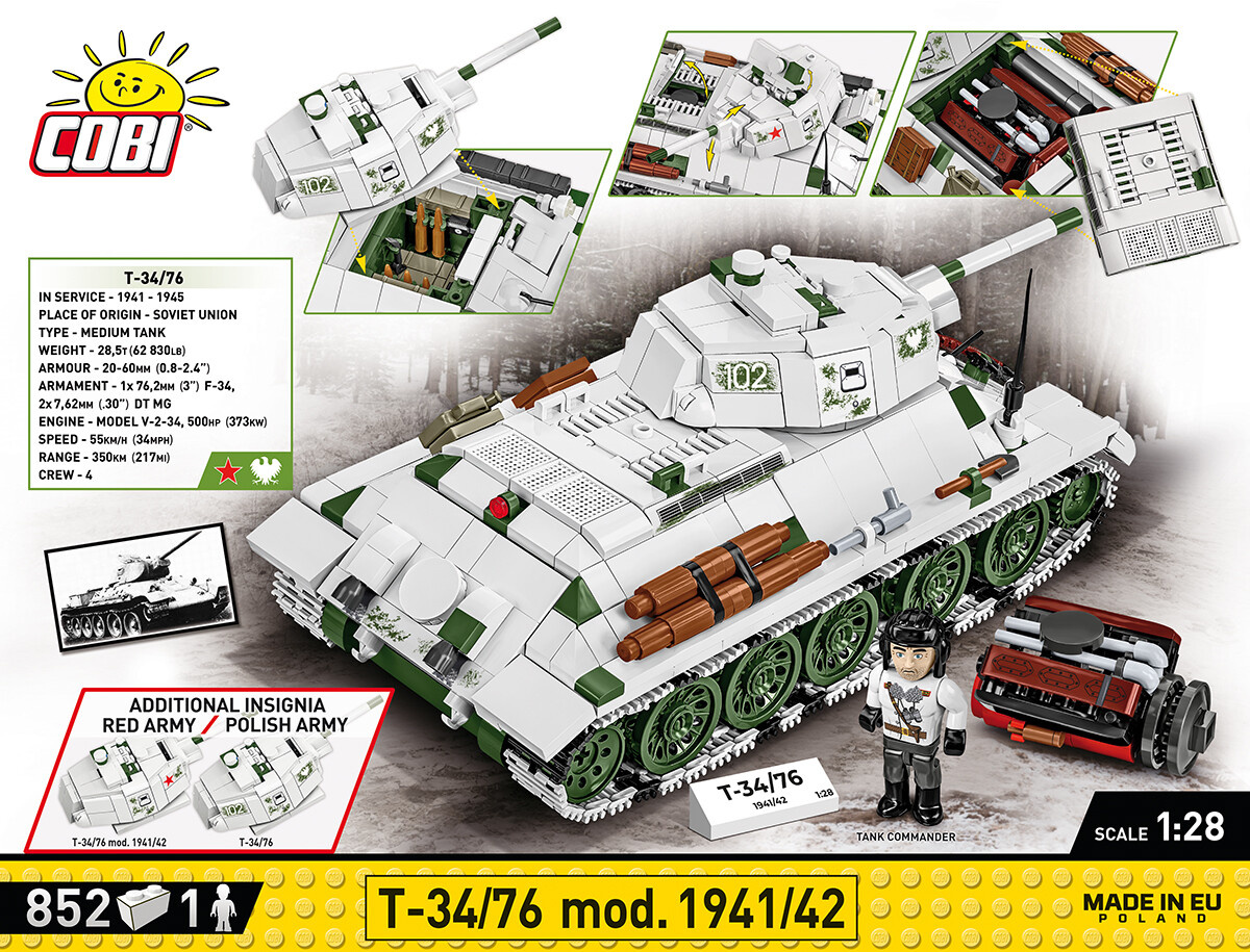 Postavte si model legendárního sovětského tanku T34/76 v měřítku 1:28. Sestavený model se skládá ze 852 dílků a měří 26 cm na délku, 11 cm na šířku a 9 cm na výšku. Sestavený model má řadu pohyblivých částí, jako je otočná věž s pohyblivým náměrem kanonu, funkční pásová trakce. Po vyjmutí věže se můžete podívat dovnitř tanku. Pod servisní poklop lze umístit model motoru. Na modelu jsou trvalé nátisky imitující oprýskávání laku, detaily vybavení a značení (na výběr je sovětské a polské).