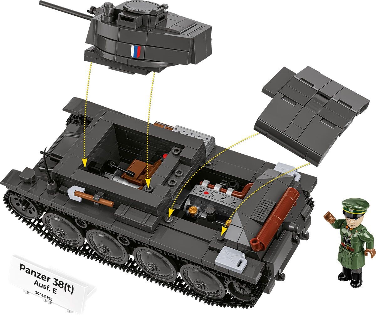 Lehký tank LT vz. 38 byl vyvinut československou firmou ČKD ve druhé polovině 30. let jako moderní, spolehlivě pancéřované a dobře manévrovatelné vozidlo. Po okupaci Československa převzala konstrukci německá armáda a pod označením Panzerkampfwagen 38(t) se z něj stal jeden z nejúspěšnějších lehkých tanků raného období druhé světové války. Nasazen byl během kampaně v Polsku (1939) i Francii (1940), kde vynikal spolehlivostí, dobrou průchodností terénem a kvalitním zpracováním. Ačkoli byla výroba základní verze ukončena v roce 1942, podvozek tanku se stal základem pro celou řadu pozdějších konstrukcí – od stíhačů tanků Marder a Hetzer až po samohybná děla. Stavebnice COBI zachycuje obě vývojové větve tohoto stroje a nabízí fascinující pohled do historie evropské obrněné techniky.