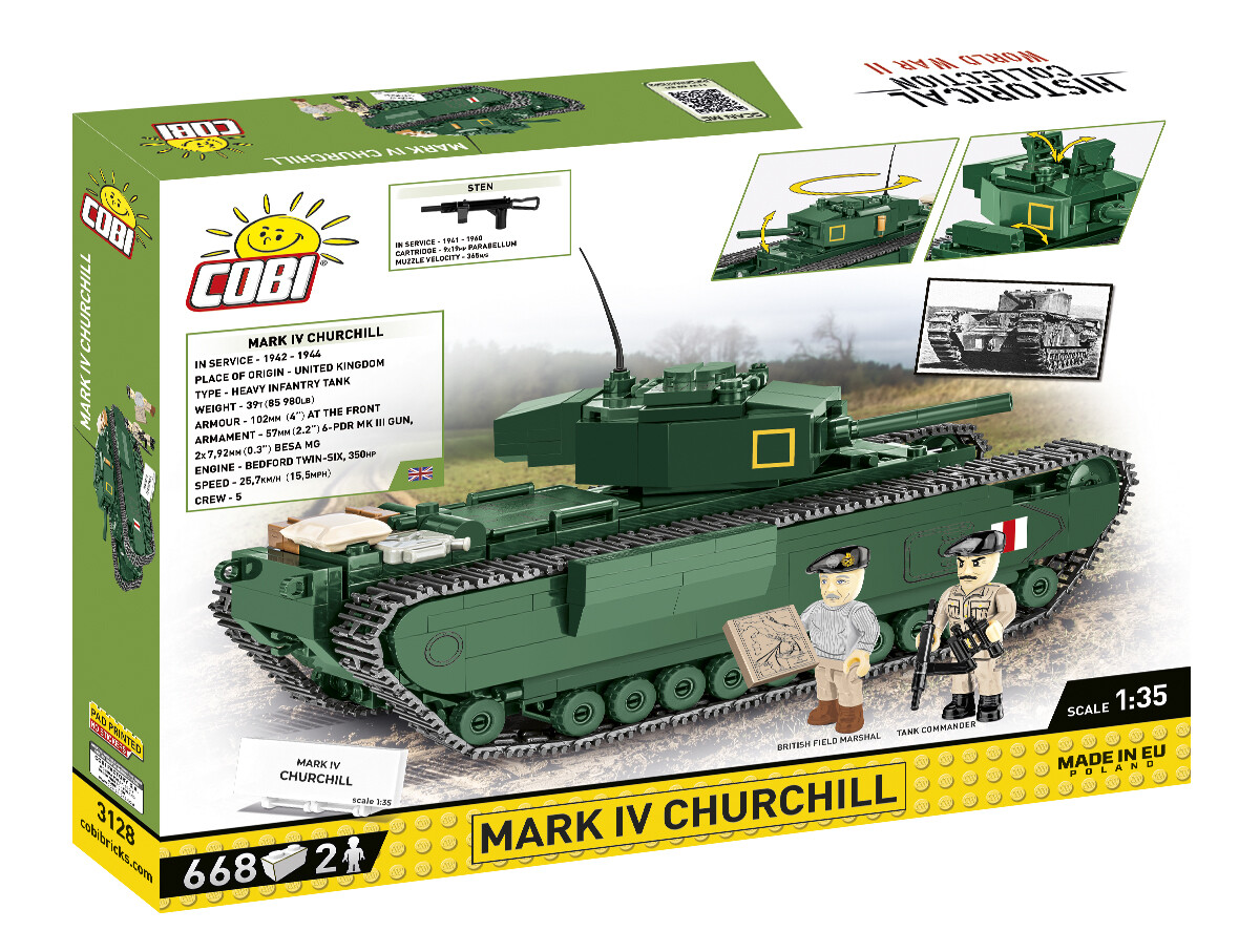 Tank Churchill patřil mezi nejvýraznější obrněná vozidla spojeneckých armád druhé světové války. Do výzbroje britské armády byl zaveden v roce 1941 a během války prošel řadou úprav a modernizací, díky nimž vzniklo mnoho specializovaných variant – od ženijních verzí až po plamenometné stroje. Churchill vynikal především silným pancéřováním, nízkou siluetou a schopností pohybu v obtížném terénu, což z něj činilo cenný prostředek při bojích v Evropě, včetně nasazení v Itálii a během invaze v Normandii. Stavebnice COBI věrně zachycuje charakter tohoto ikonického tanku a nabízí atraktivní model pro fanoušky vojenské historie i sběratele obrněné techniky.