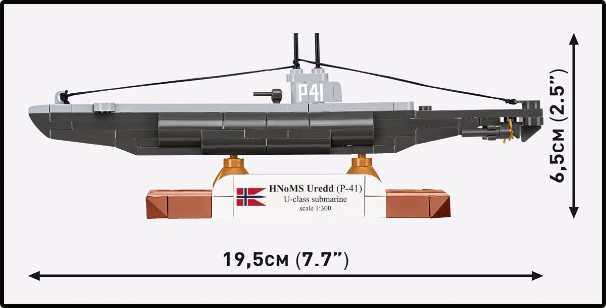 Postavte si HNoMS Uredd (P-41), legendární norskou ponorku z období druhé světové války, která se stala symbolem odvahy a oběti své posádky. Tento model v měřítku 1 : 300 obsahuje 142 kostek a po sestavení dosahuje rozměrů 19,5 cm na délku, 6,5 cm na šířku a 4 cm na výšku. Věrně zachycuje charakteristickou siluetu ponorky třídy U, včetně detailů trupu, věže a kormidel. Model je vybaven pohyblivými řídicími prvky a lodními šrouby a nechybí ani sběratelský podstavec s tabulkou. Všechny detaily jsou provedeny pomocí trvalých potisků bez použití samolepek.