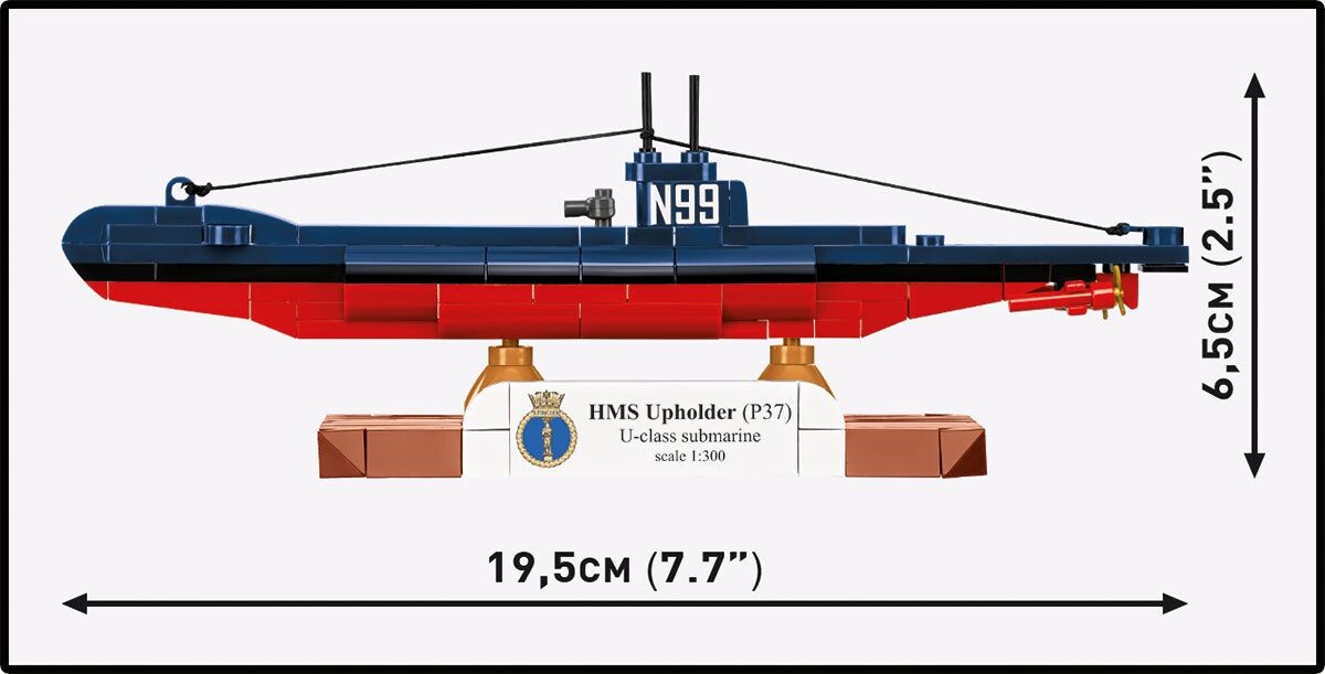Postavte si HMS Upholder (P37), jednu z nejúspěšnějších ponorek Royal Navy z období druhé světové války. Tento model v měřítku 1 : 300 obsahuje 140 kostek a po sestavení dosahuje rozměrů 19,5 cm na délku, 6,5 cm na šířku a 4 cm na výšku. Věrně zachycuje štíhlý trup, charakteristickou věž i detaily konstrukce ponorek třídy U. Model je doplněn o pohyblivé kormidla a lodní šrouby a sběratelský podstavec s tabulkou, ideální pro vystavení. Všechny detaily jsou provedeny pomocí trvalých potisků bez použití samolepek, což zaručuje dlouhou životnost a perfektní vzhled.