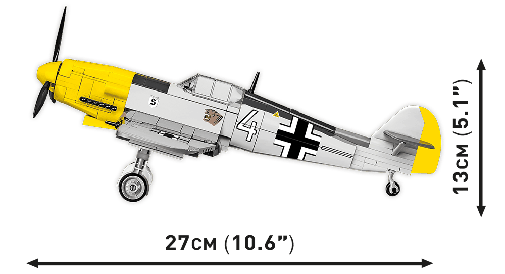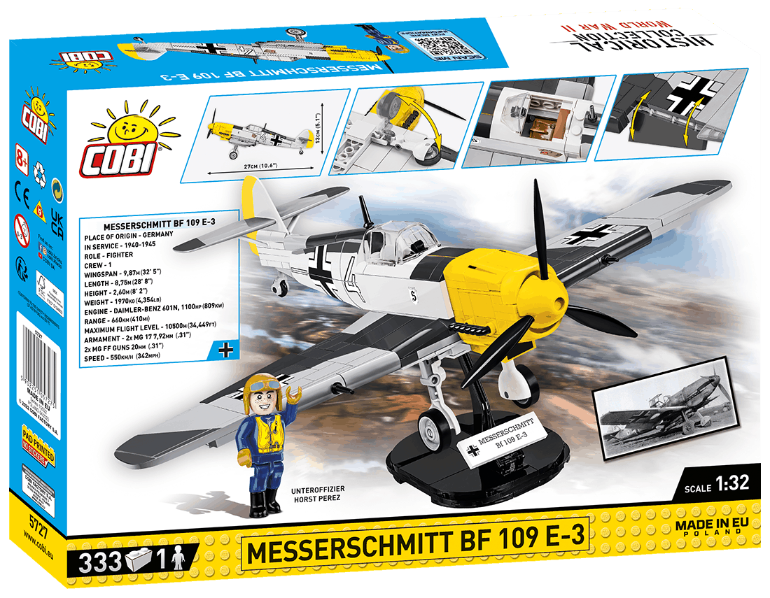 Postavte si stíhacie lietadlo Luftwaffe z druhej svetovej vojny Messerschmitt BF-109 E-3 v mierke 1:32. Lietadlo má pohyblivú vrtuľu a krídelká. Jeho rotačné gumové kolesá sa vysúvajú z podvozku vo vzletovej alebo pristávacej polohe. Kabínu pilota je možné otvoriť a posadiť figúrku na ovládanie, ktoré má tiež potlač na zadnej strane! Zostavený model meria 27 cm na dĺžku, 13 cm na výšku a rozpätie krídiel má 30,5 cm. Stavebnica sa skladá z 333 dielikov a obsahuje jednu figúrku. Súčasťou sady je aj špeciálny stojan, ktorý zatraktívni vystavenie modelu, a štítok s názvom lietadla. Kocky COBI sú plne kompatibilné so stavebnicami LEGO.