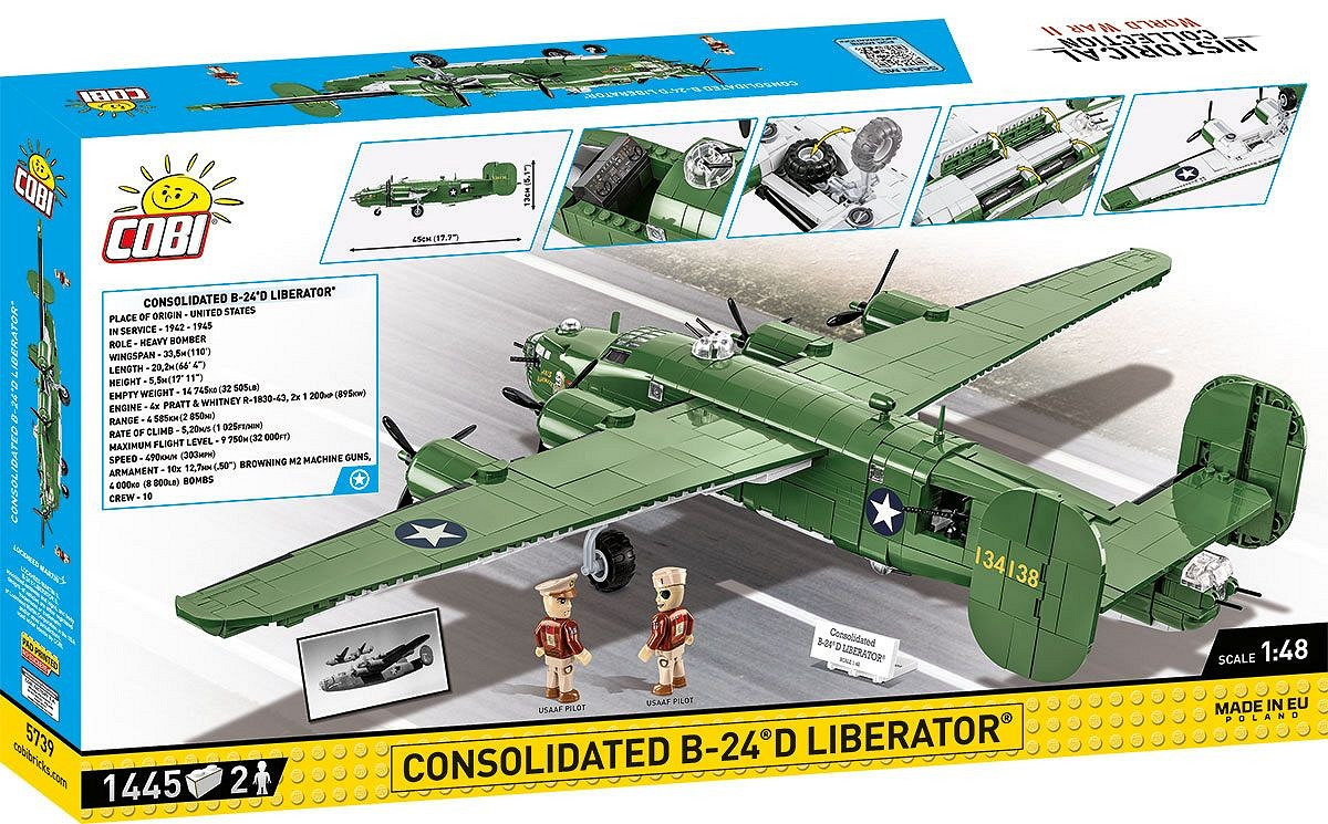 Postavte si model štvormotorového bombardéra Liberator v mierke 1:48. Zostavený model sa skladá z 1445 prvkov a meria 45 cm na dĺžku, 13 cm na výšku a má rozpätie krídiel 68,5 cm. V odnímateľnom kokpite sú dve figúrky amerických pilotov opatrené detailnými potlačami na prednej aj zadnej strane, ktoré dokonale imitujú uniformy letcov v tichomorskej oblasti. Model má množstvo pohyblivých prvkov, ako sú otočné vrtule, krídelká, zasúvací podvozok a otvárateľná pumovnica. Stavebnica je vybavená aj štítkom s názvom lietadla.