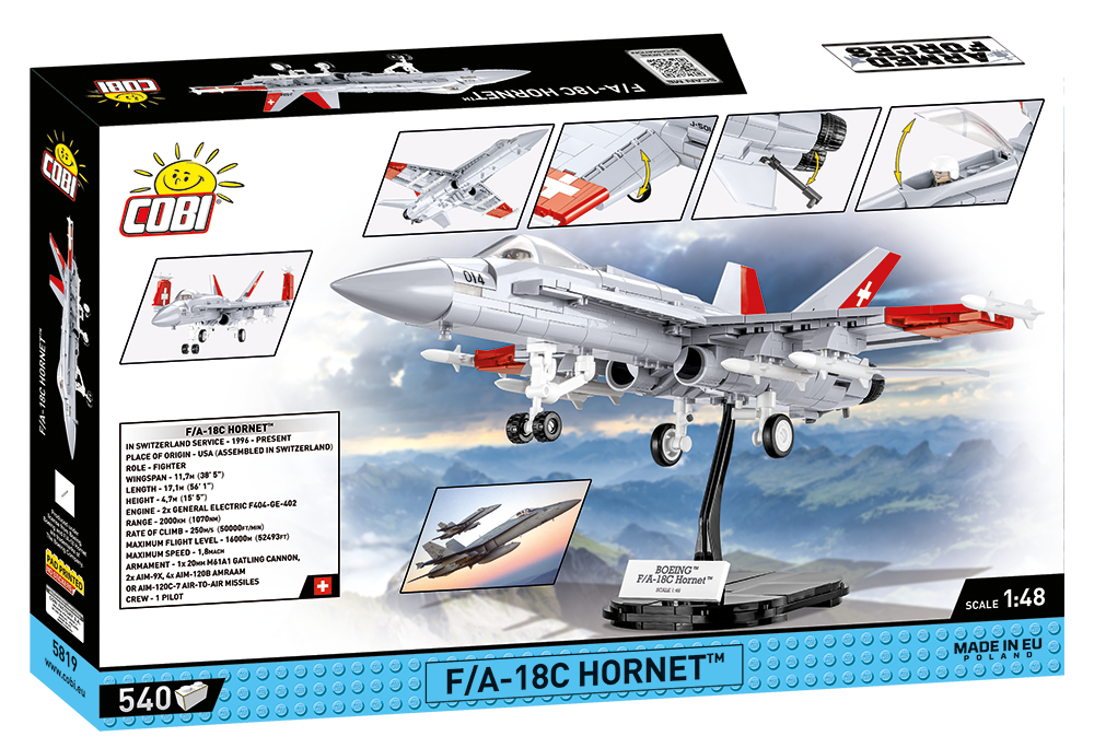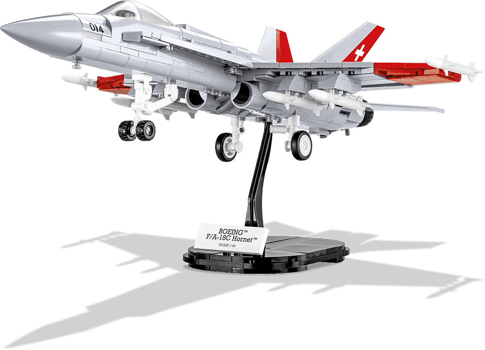 Postavte si víceúčelový stíhací letoun F/A-18C Hornet™ v originálním švýcarském zbarvení! Tento model v měřítku 1:48 obsahuje 540 kostek a přináší nejen detailní zpracování, ale i funkční prvky jako sklápěcí podvozek, otočná kolečka, bohatou výzbroj pod křídly a otvírací kabinu pro pilota – kterého najdete jako součást stavebnice. Nechybí ani elegantní stojánek s tištěným štítkem pro vystavení modelu. Autentické potisky zaručují dlouhou životnost a odolnost vůči opotřebení. F/A-18C Hornet vypadá působivě nejen ve vitríně, ale i jako součást sbírky všech fanoušků armádních strojů a moderní letecké techniky.