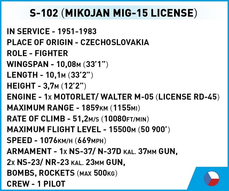 Postavte si model letounu MIG-15 (S 102) v historické kamufláži a markingu československého letectva v měřítku 1:32. Model má pohyblivé prvky, jako je odnímatelní podvozek a otevírací překryt kokpitu, do kabiny lze umístit figurku československého pilota. Sestavený model se skládá z 504 dílků a měří 32 cm na délku, 32 cm na šířku a 11 cm na délku.