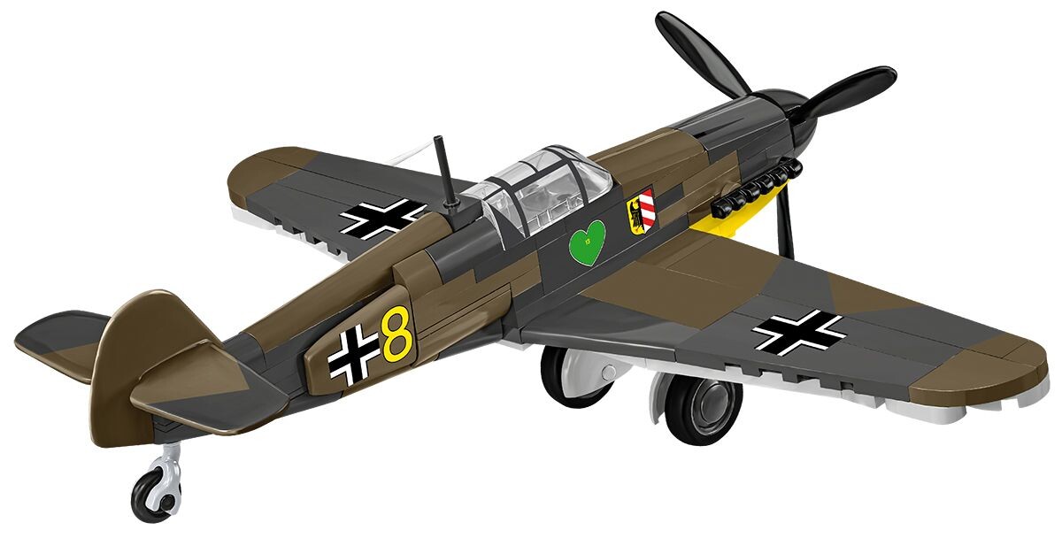 Postavte si Messerschmitt Bf 109F, legendární německý stíhací letoun druhé světové války v provedení jednotky se symbolem „Zeleného srdce“. Tento model v měřítku 1 : 48 obsahuje 123 kostek a po sestavení dosahuje rozměrů 19 cm na délku, 21 cm na šířku a 9 cm na výšku. Model věrně zachycuje charakteristickou siluetu verze Bf 109F a je vybaven pohyblivou vrtulí, pohyblivými křidélky a odnímatelným podvozkem s gumovými pneumatikami, což umožňuje vystavení v letové i stojící konfiguraci. Veškeré detaily a označení jsou provedeny pomocí trvalých potisků bez použití samolepek, včetně znaku jednotky Jagdgeschwader 54 „Grünherz“ (Zelené srdce).