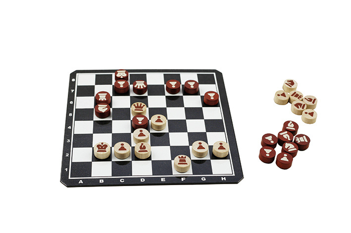 Oblíbená společenská hra šachy, v cestovním provedení. Hra obsahuje plechovou tabulku a dřevěné herní kameny s potiskem, podlepené magnetem. Baleno v krabici.