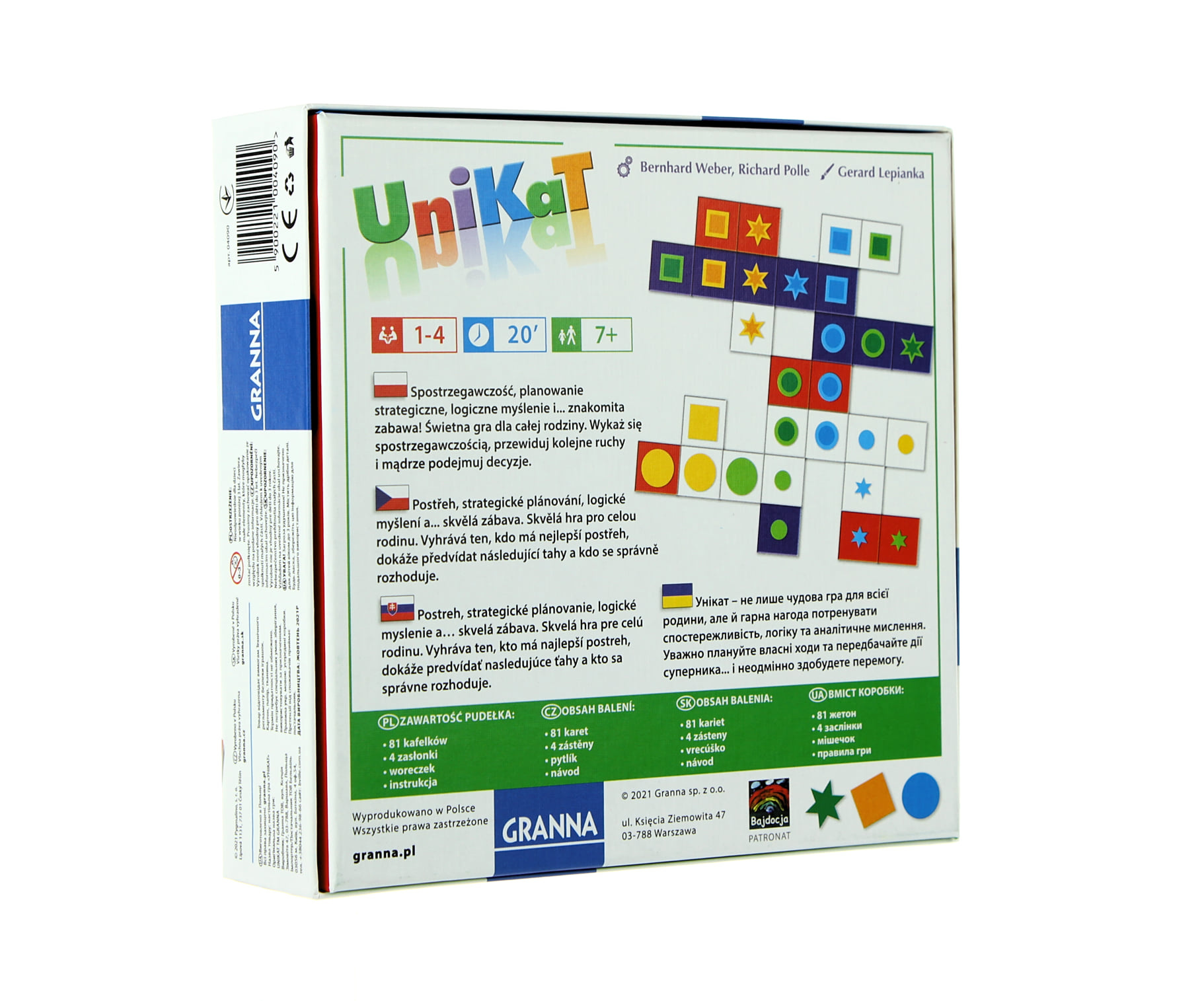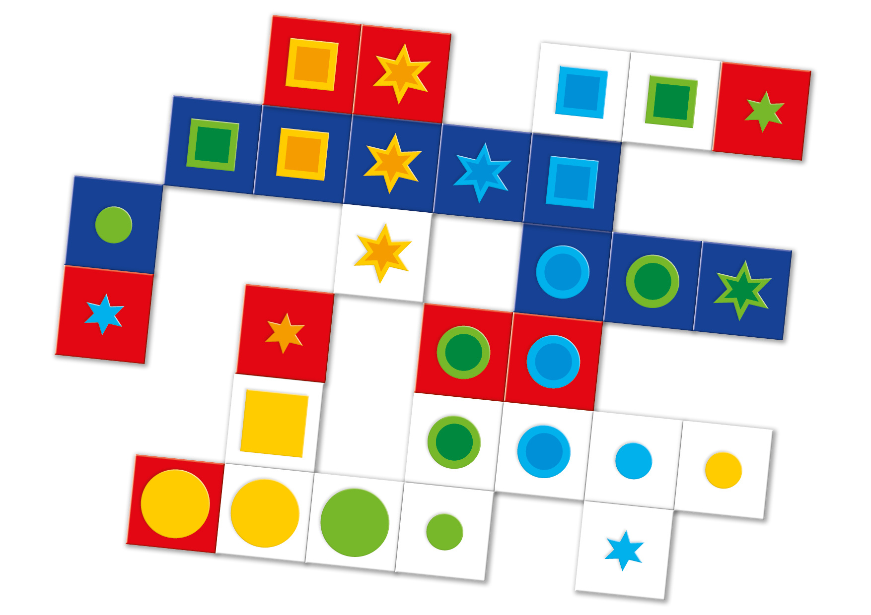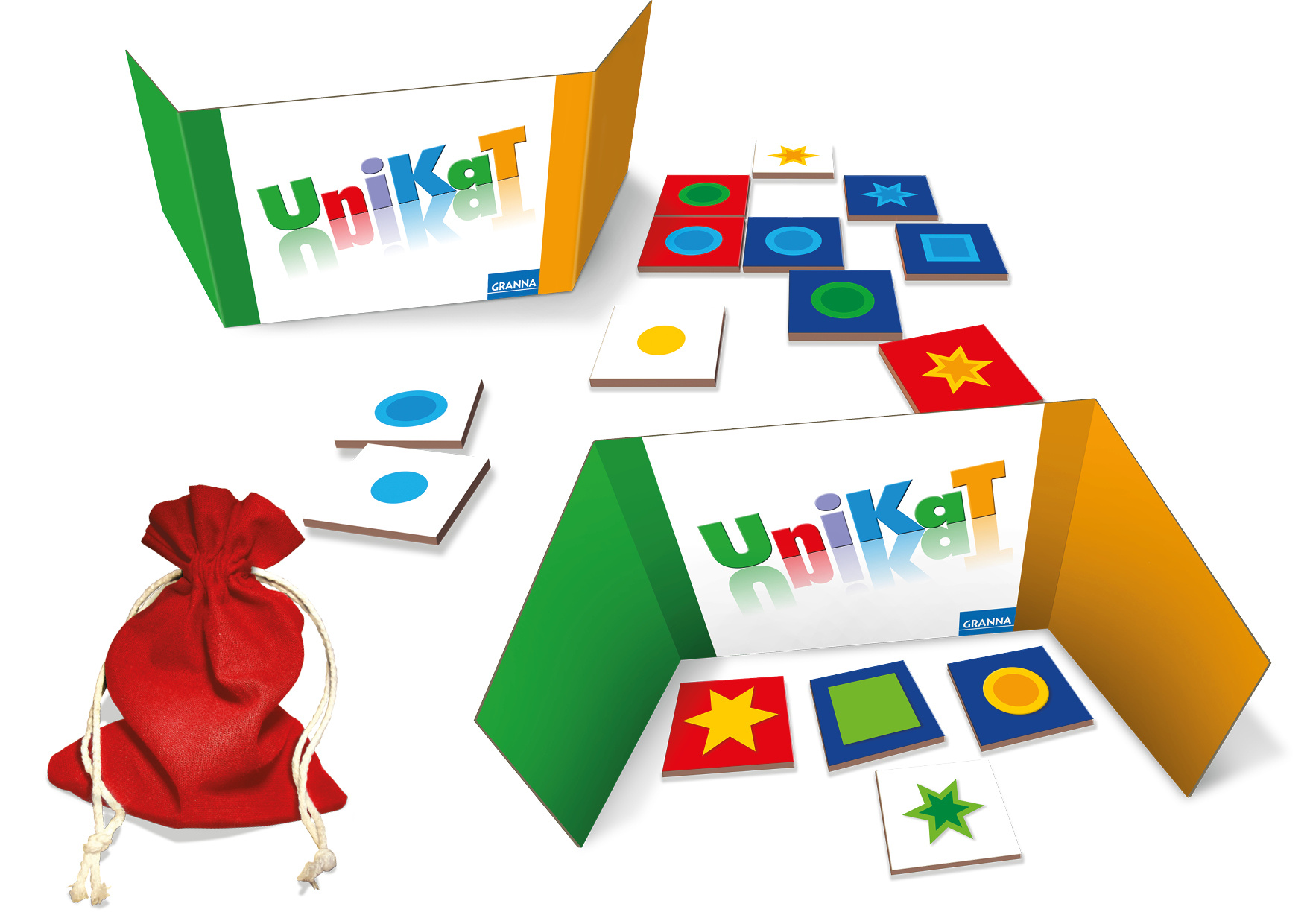 Skvělá logická hra pro 1 až 6 hráčů ve věku od 7 let rozvíjí schopnost koncentrace, strategického myšlení a rychlé reakce v závěrečné fázi hry. Vyhrává totiž ten, kdo má nejlepší postřeh, pozorovací a kombinační schopnosti, dokáže šikovně předvídat následující tahy a správně se rozhoduje. Hráči postupně pokládají na stůl čtverce s geometrickými obrazci. Podmínkou je, aby se vedle sebe ležící čtverce lišily pouze v jednom znaku: tvaru obrazce, jeho barvě, velikosti nebo barvě pozadí. Vítězem se stává hráč, který se jako první zbaví všech svých čtverců. Jednoduchá pravidla, stačí jen otevřít krabičku a začít hrát.