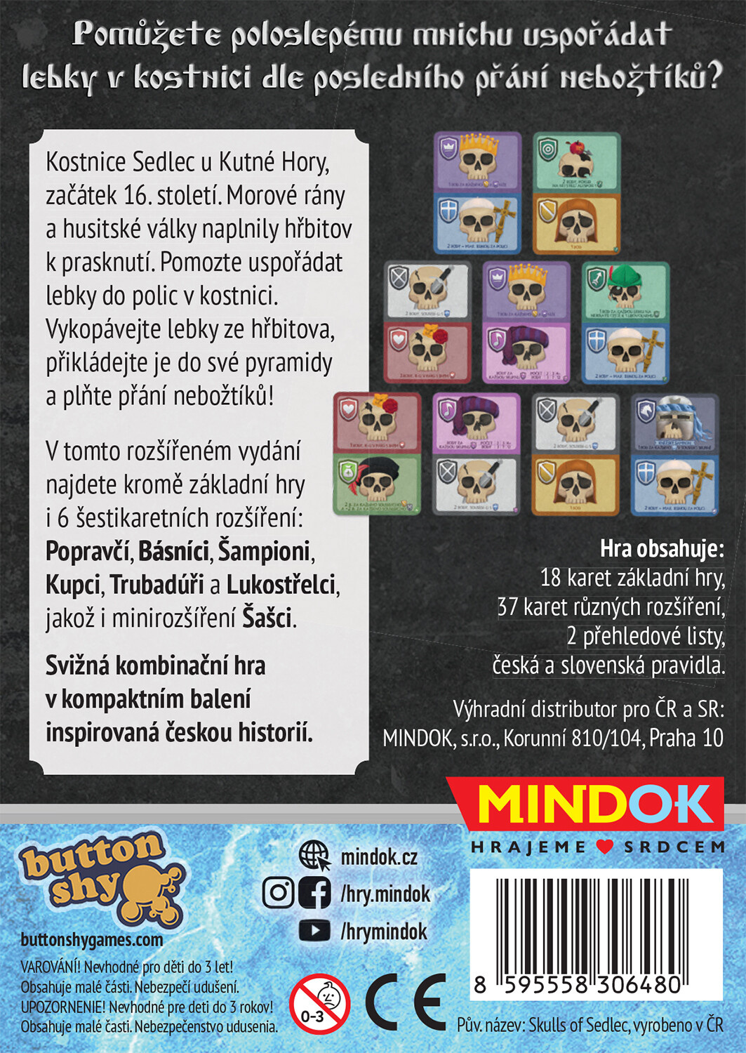 V této krabičce najdete mimo základní hru i 6 různých rozšíření po 6 kartách a jedno mini rozšíření, které budete moci libovolně přidávat do svých partií. Díky tomu bude možné zahrát si Kostnici i ve 4 a 5 hráčích!