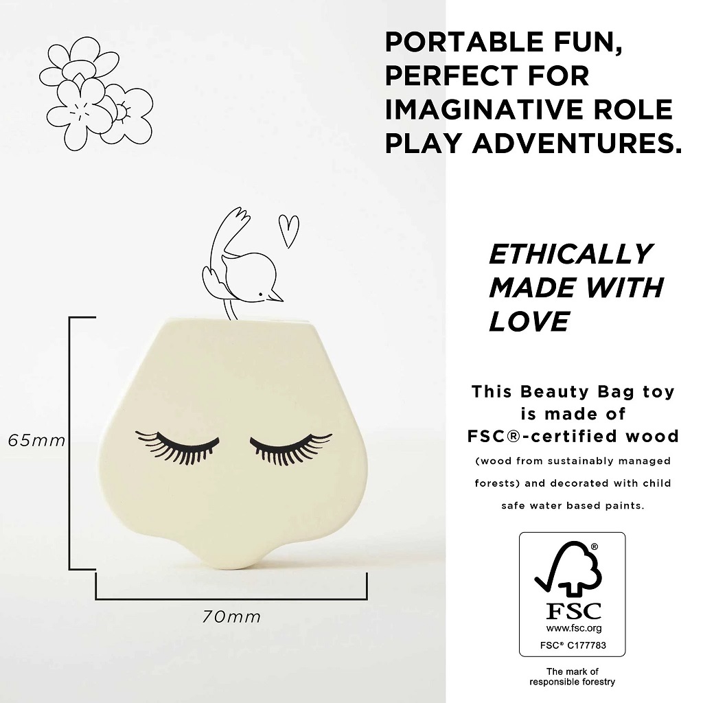 Buďte hvězdami ve vlastní show! Kosmetickou tašku si zamilují malé kostymérky a kostyméři, s jejím obsahem vytvoří úžasný make-up a účes. Taška je vyrobena z přírodní bavlny, její vybavení je z hladkého a zaobleného dřeva, to vše je ručně malováno netoxickými barvami. Malí vizážisté a vizážistky mohou začít tvořit své dílo. Nechybí krém, oční stíny a aplikátor, pudr a labutěnka, parfém, rtěnka, fén, hřeben, zrcátko, lak na nehty a štěteček, textilní pytlík. Perfektní hračka pro hru na role je vyrobena z FSC dřeva, zdobí ji barvy, které jsou bezpečné pro děti.