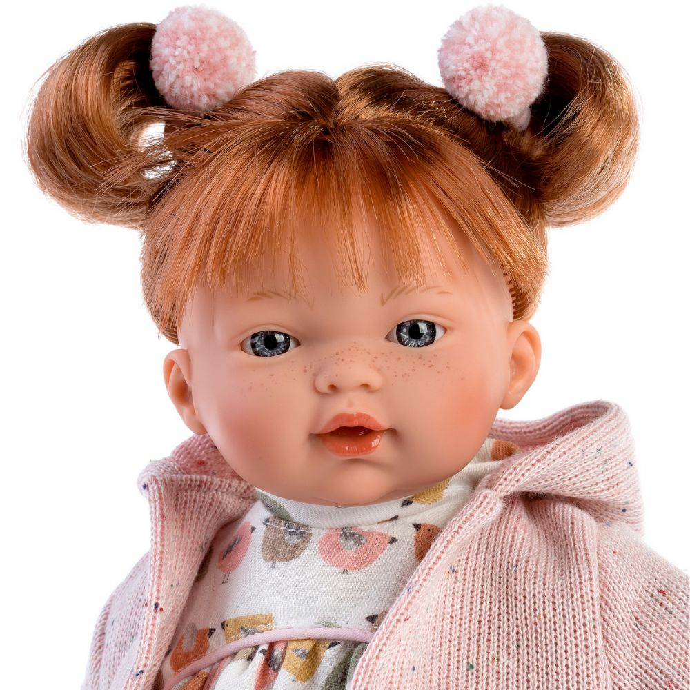 Mluvící panenka s měkkým látkovým tělem a s vlásky po celé hlavě. Po vytažení dudlíku z úst začne panenka říkat „mama“, „papa“ a vydávat reálný zvuk plačícího miminka. Panenku lze utišit dudlíkem. Velikost 33 cm. Součástí balení je 3 x knoflíková baterie LR44.