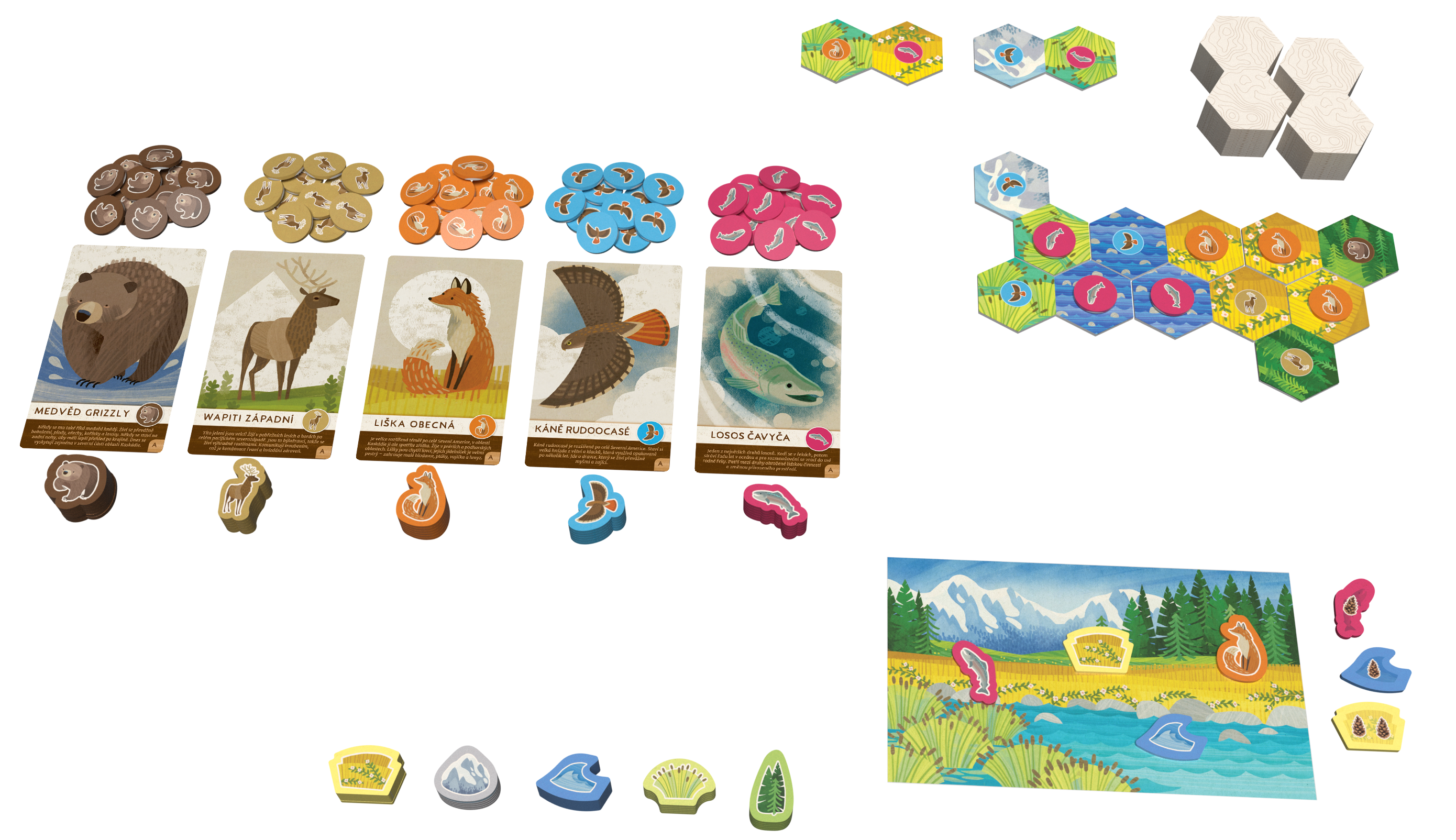 - Nádherné zpracování: Hra obsahuje ilustrované karty a žetony s pěti druhy zvířat – od majestátního grizzlyho po mrštného lososa.