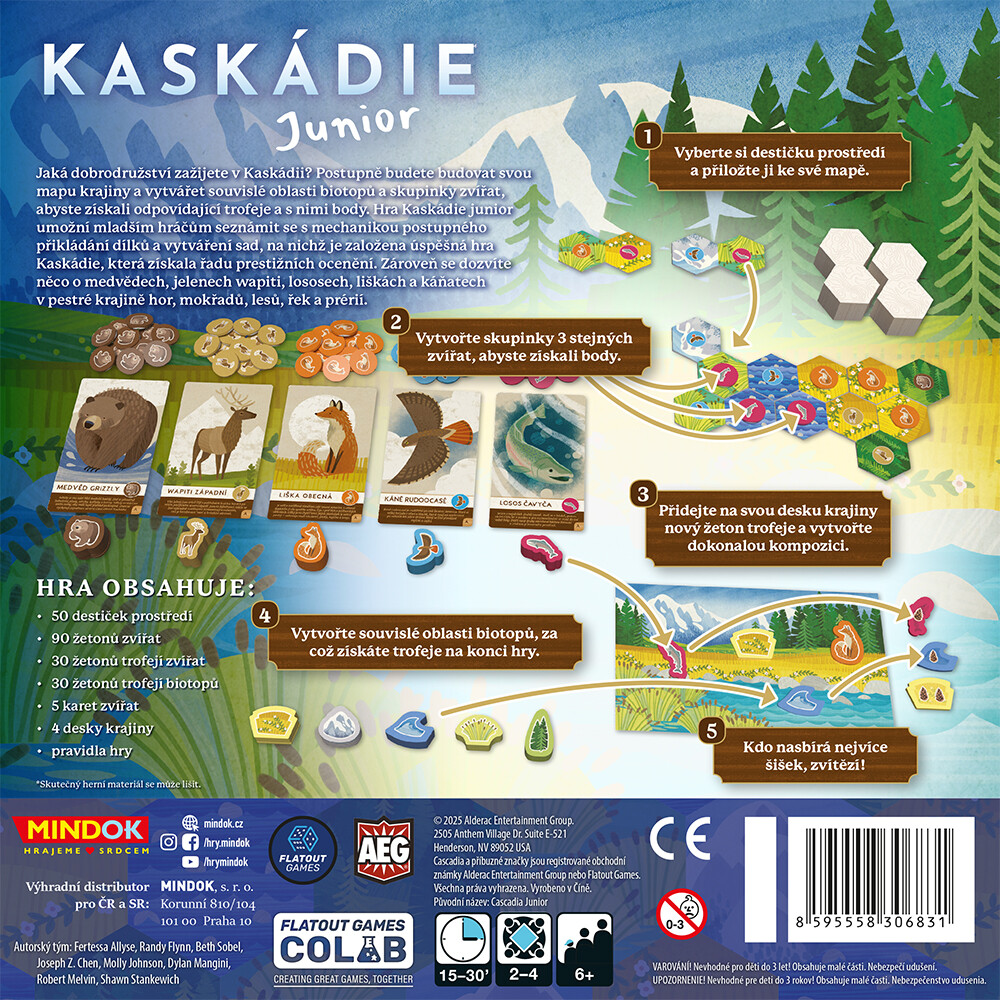 Vítejte v divoké přírodě severozápadní Ameriky! Kaskádie Junior je přístupná a graficky nádherná rodinná hra, ve které se stanete architekty vlastní krajiny. Vaším úkolem je skládat k sobě destičky různých biotopů a osidlovat je ikonickými zvířaty tak, aby vaše přírodní rezervace vzkvétala a přinesla vám co nejvíce vítězných bodů v podobě šišek.