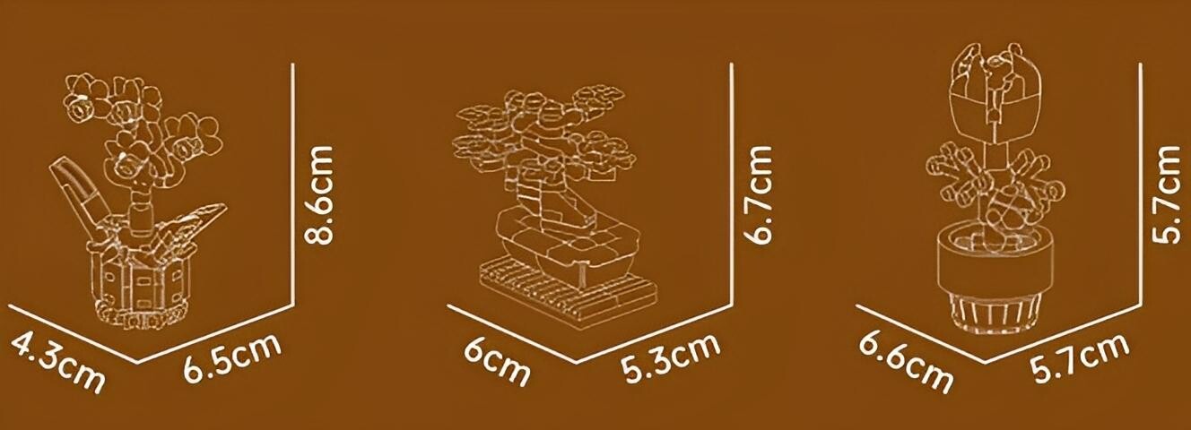 - Bonsaj: 6,7 × 6,0 × 5,3 cm