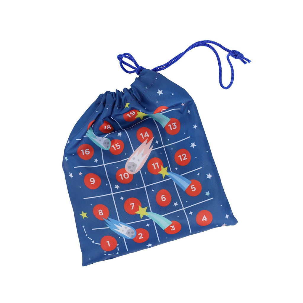 Procestujte galaxii se dvěma oblíbenými hrami! Cestovní hra 2 v 1 Vesmírné dobrodružství je verzí klasických zábavných her piškvorky a hadi a žebříky. Součástí hry je 10 ks dřevěných figurek ve tvaru raket a planet, hrací kostka a návod ke hře. Hráči pohybují planetami a raketami po mřížkách vytištěných na praktickém cestovním pytlíku se stahovací šňůrkou s motivy vesmíru. Když se hráč zastaví na políčku s obrázkem komety, postoupí o řadu výše a políčko s padajícím meteoritem jej zase vrátí o řadu níže.