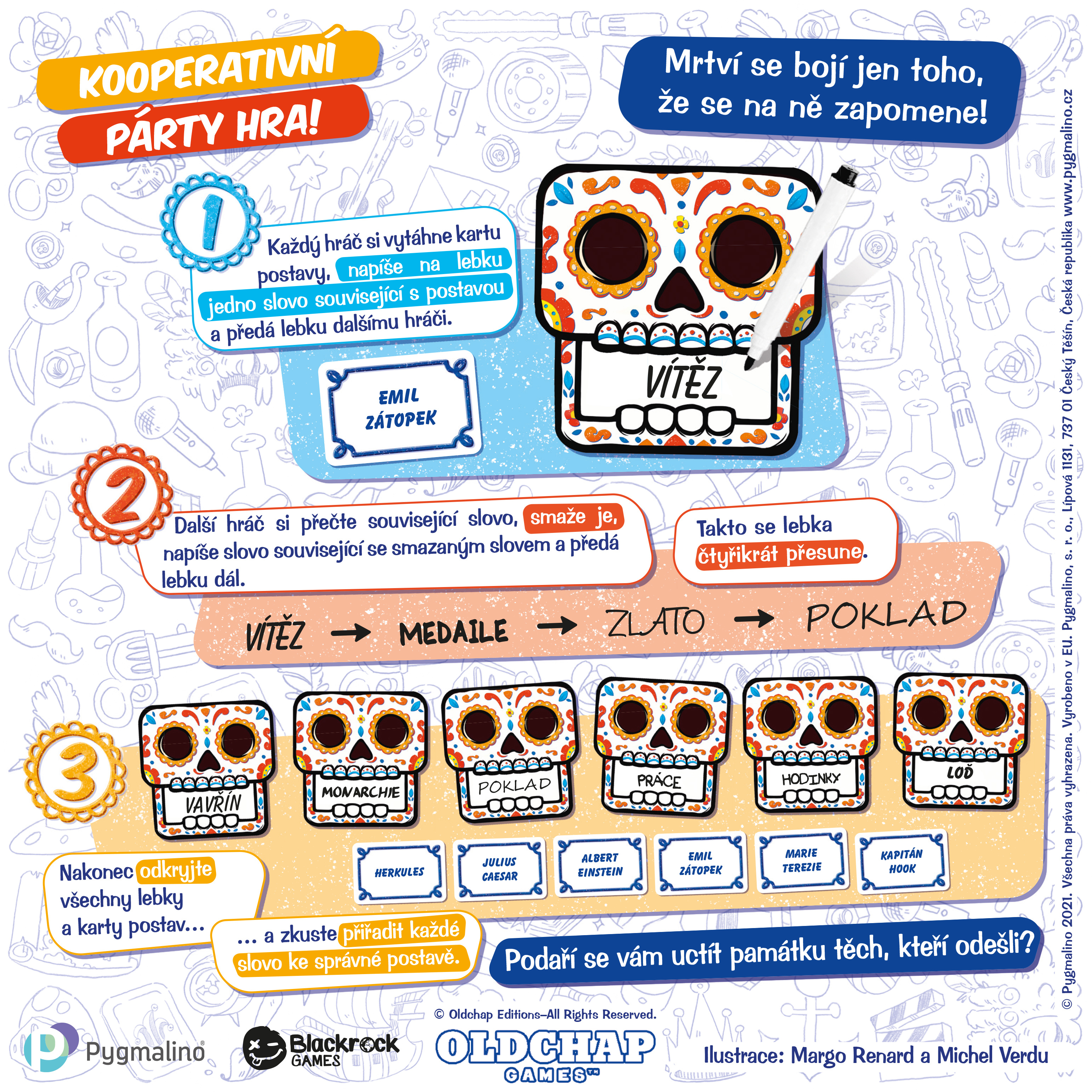V této kooperativní hře si každý hráč vytáhne z balíčku kartičku s postavou. Vylosovanou postavu tajně napíše dovnitř lebky a tu ihned uzavře. Mezi čelisti lebky napíše (opět tajně) slovo, které s postavou souvisí, a lebku předá hráči po levé ruce. Takto se lebka posune celkem 4×, aniž by ji hráči otevřeli, přičemž každý z hráčů smaže slovo mezi čelistmi a nahradí je jiným slovem s ním souvisejícím. Lebky jsou předávány vždy zavřené a lícem dolů a hráči mezi sebou nesmějí nijak komunikovat. Po čtvrtém předání lebky pak nastane fáze dohadů, která postava je ve které lebce. Každý z hráčů hádá sám za sebe, aby pak všichni společně dokázali uctít zesnulé.