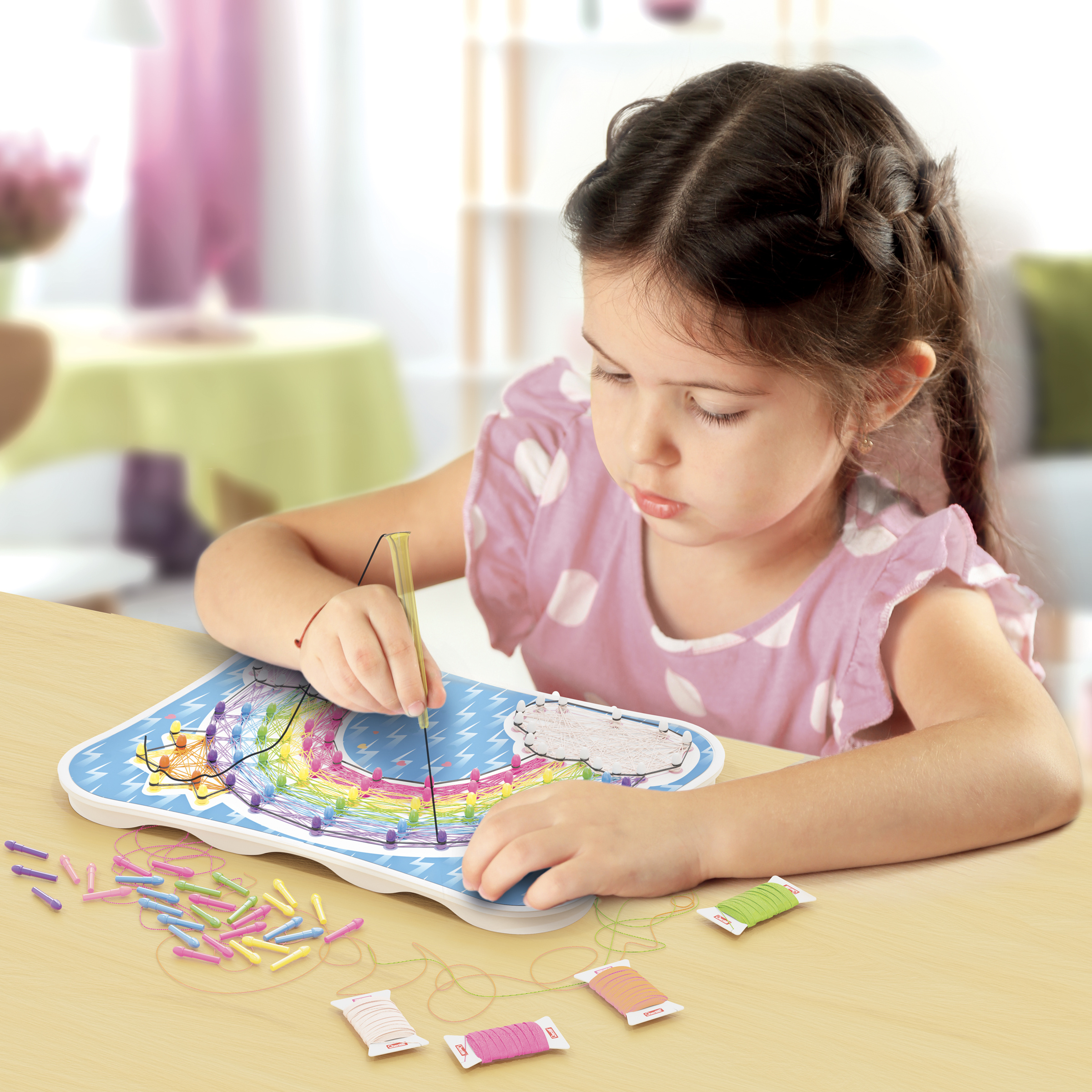 Pomocí duté tyčinky mohou děti od 4 let snadno natahovat nitě mezi kolíčky a jakoby kouzlem „kreslit“ různorodé obrázky v nekonečném množství barevných variací. Při tvůrčí zábavě tak procvičují a zdokonalují svou jemnou motoriku i manuální zručnost a rozvíjejí koordinaci ruky a oka i kreativní myšlení.