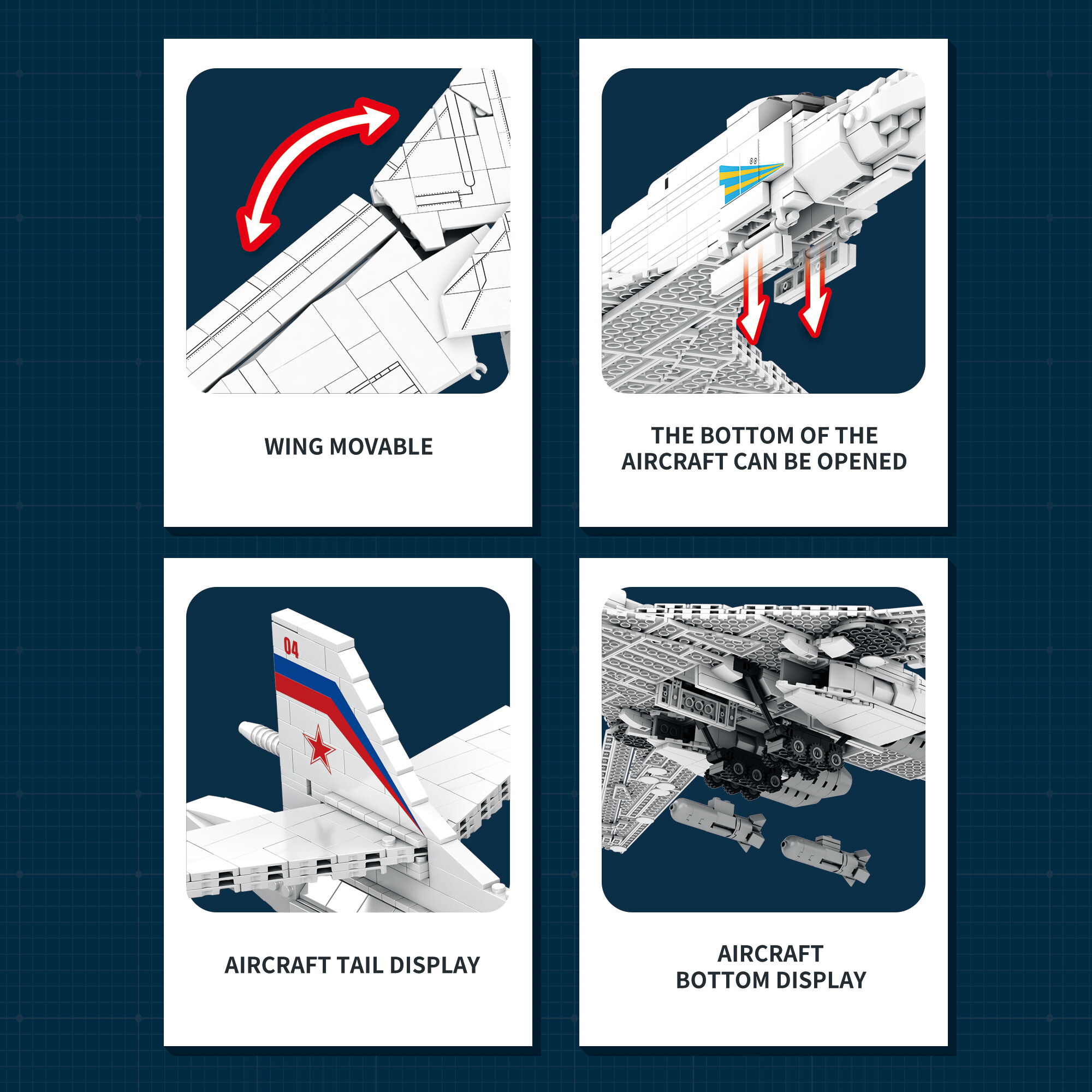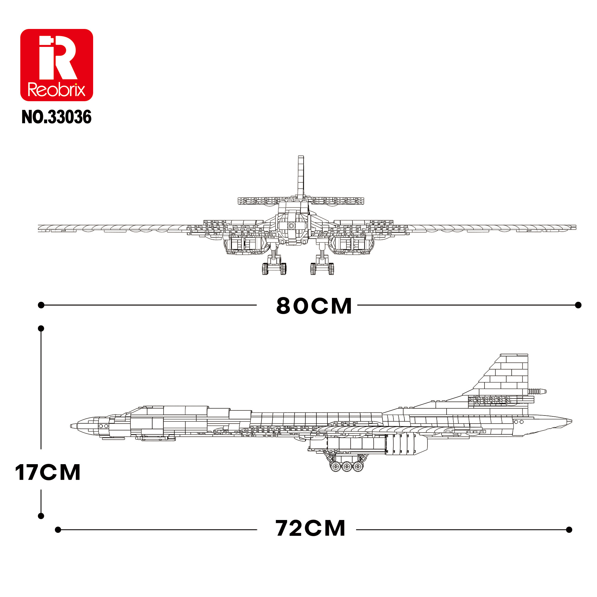 Postavte si legendu vojenského letectví v podobě detailního sběratelského modelu! Reobrix 33036 Bombardér TU-160 je rozsáhlá technická stavebnice inspirovaná nadzvukovým strategickým bombardérem Tupolev TU-160 „Bílá labuť“ (bez licence) – jedním z největších a nejrychlejších bombardérů světa. Model vyniká elegantní siluetou, promyšlenou konstrukcí a impozantními rozměry, díky nimž se stává dominantou každé sbírky.