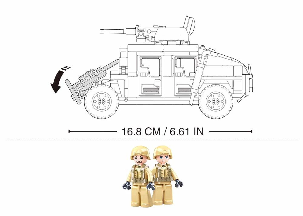 Postavte si model bojového offroad auta Hummer. Sestavené vozidlo měří 16,8 cm na délku. Model obsahuje pohyblivé části jako je například otevírací kufr. Stavebnice obsahuje 265 kostek a 2 minifigurky.