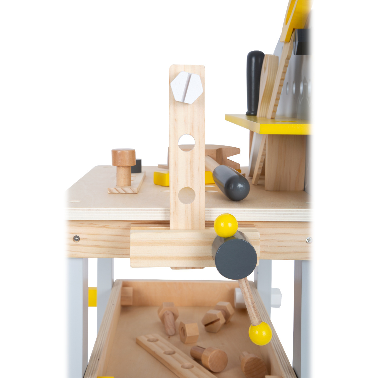 V této dílně se toho děje opravdu hodně. S tímto kompaktním ponkem v klasických barvách, který je viditělně dřevěný si děti mohou otestovat svou zručnost. Děti vám také mohou pomoci se složením tohoto herního ponku! Všechno nářadí a doplňky můžete do ponku uložit tak, aby nezabíraly moc místa. V balení 5 kusů nářadí a mnoho doplňků – 1 svěrák, 3 perforované dřevěné pásky, 1 metr, 1 pilka, 2 šroubováky, 1 kladivo, 5 šroubů, 5 matek, 3 dřevěné hřebíky.