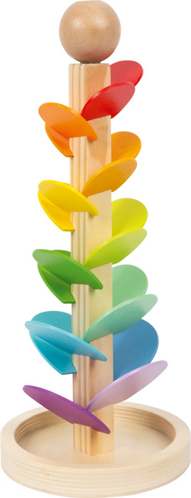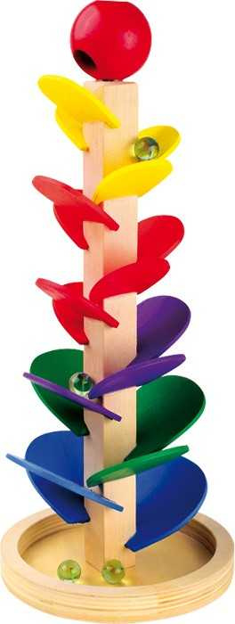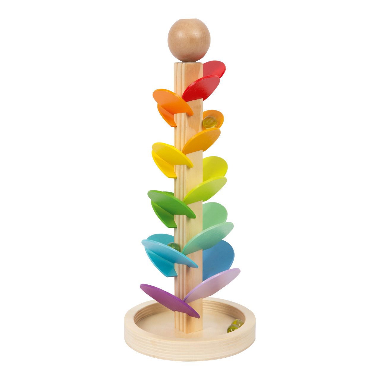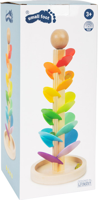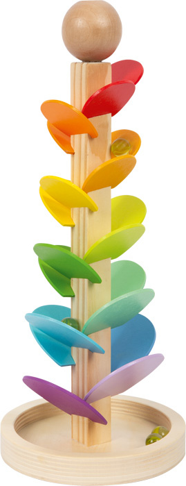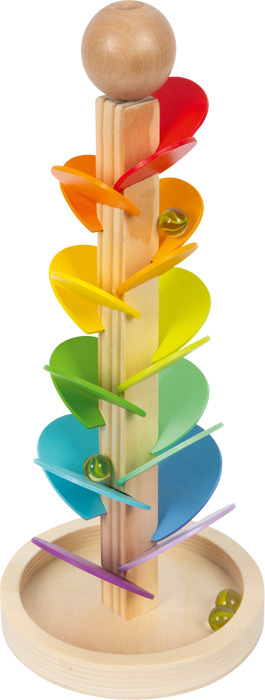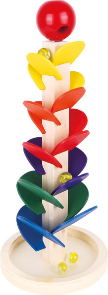 Sledujte a poslouchejte. Tato kuličková dráha poskytuje opravdický zvukový zážitek. Jakmile se skleněná kulička vloží do dřevěné dráhy, lze postupně slyšet různé zvuky, protože cestou dolů padá na různě veliká dřevěná křídla podobná větrníku, čímž vznikají různé zvuky. Zvuk se mění seshora dolů od vyšších tónů k nižším tónům ve spodní části. Děti budou nadšeny. Kuličky jsou součástí balení. Fotografie jsou ilustrační, produkt se může lišit v barevných detailech.