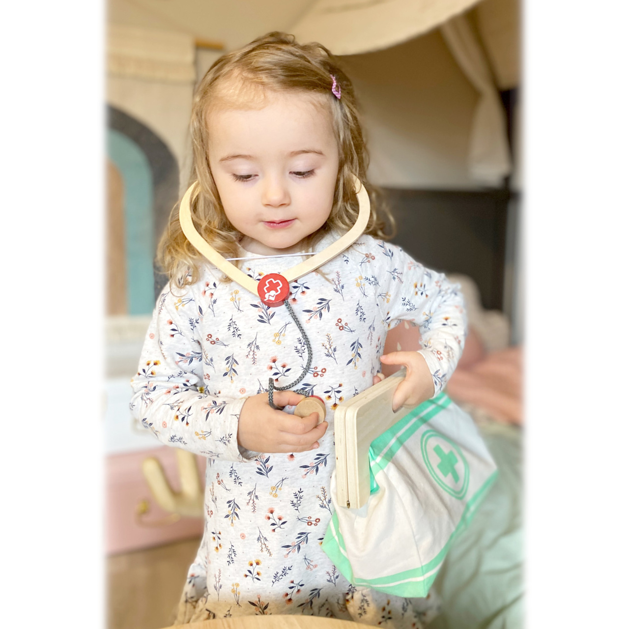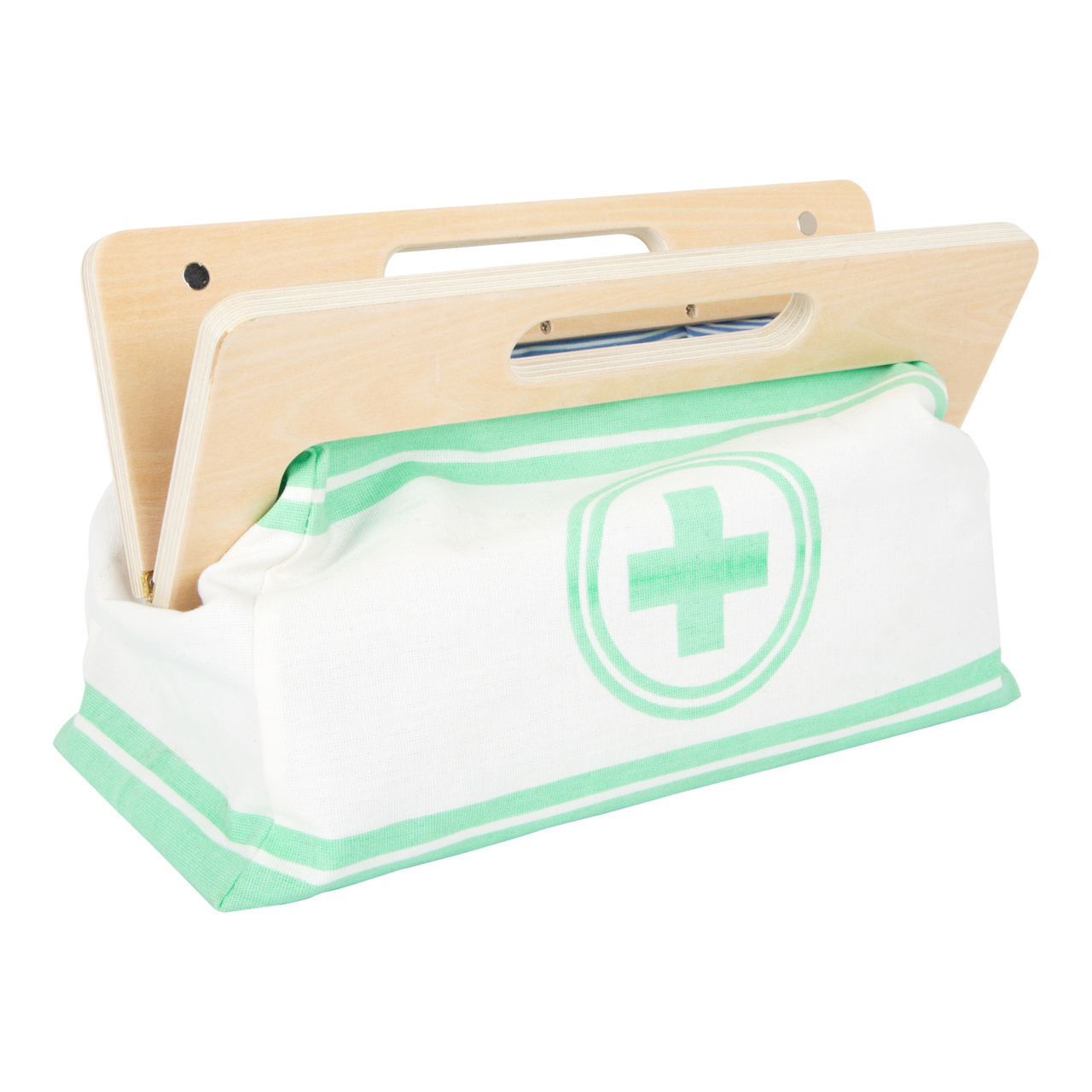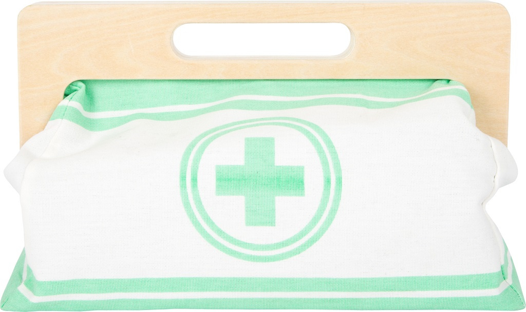 S touto standardní lékařskou brašnou budou mladí nadějní lékaři perfektně vybaveni. Brašna je vyrobená z měkkého textilu, je pěkná na pohled a také velmi funkční. Lze lehce otevřít díky magnetům, je vyrobena ze dřeva. Uvnitř brašny najdete všechno vybavení pro představivé ošetření pacientů: stetoskop, teploměr, stříkačku a mnoho dalšího – vše vyrobeno z pevného dřeva! Nejlepšími doplňky jsou zřejmě tlakoměr s manžetou a balónkem a otoskop s lupou. Tento obsáhlý set lékařských hraček obsahuje mnoho „opravdových“ lékařských nástrojů a přístrojů, s kterými si děti opravdu vyhrají. Ilustrace na lékařských pomůckách dětem poradí rozeznat nástroje a také jim možná zjednoduší jejich použití.