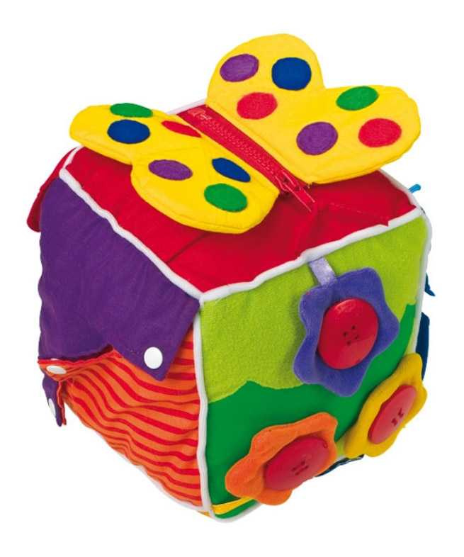 Plyšová kostka s různými zapínáními pro motorická cvičení dětských prstů. Každý typ zapínámí se nachází na jiné straně kostky - šněrování, knoflíky, na zip, na patentky, na suchý zip a pomocí nylonových tkaniček.