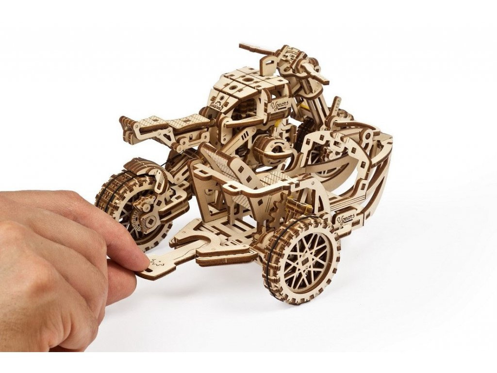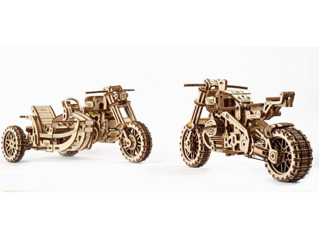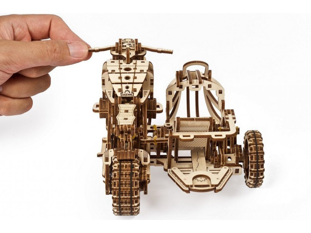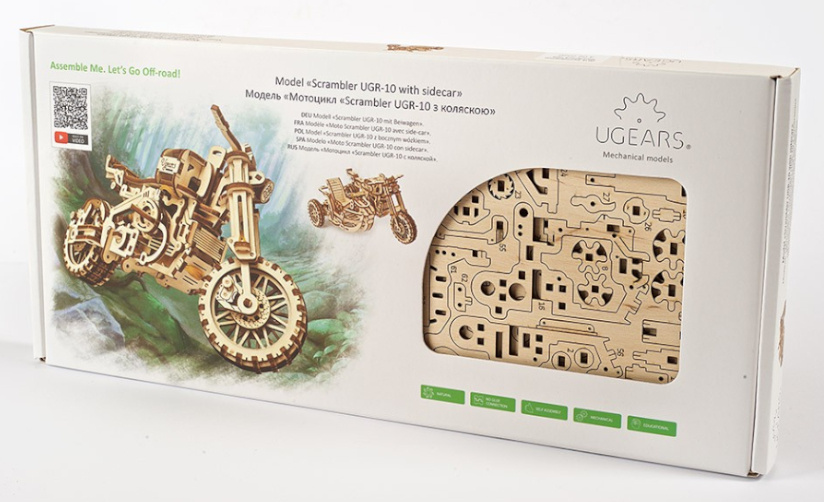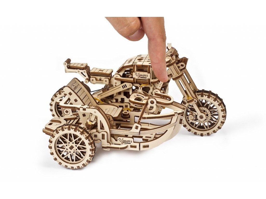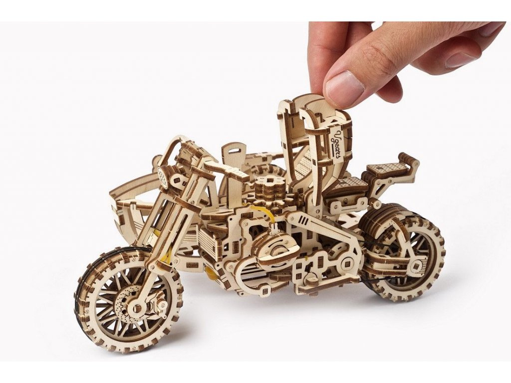 Vydejte se cestou necestou. Stavebnice motorky typu scrambler se sajdkárou vyrobená z překližky. Model je realisticky vybaven stojanem a stroj si tak můžete vystavit zvlášť i bez vozíku. Mechanika je do detailu propracovaná, a vy tak můžete pozorovat pohyb pístů motoru. Motorka je řiditelná a díky natahovacímu mechanismu je schopna jízdy, na jedno natažení urazí až 3 m. Natahuje a spouští se zvlášť určenými klíči. Jízdní dynamice slouží odpružení obou vidlic. Uspořádejte závody s dalšími modely UGEARS! Vybaveno detailním návodem k sestavení.