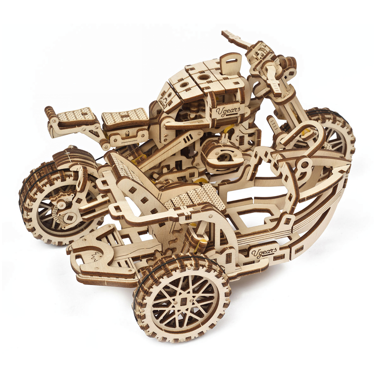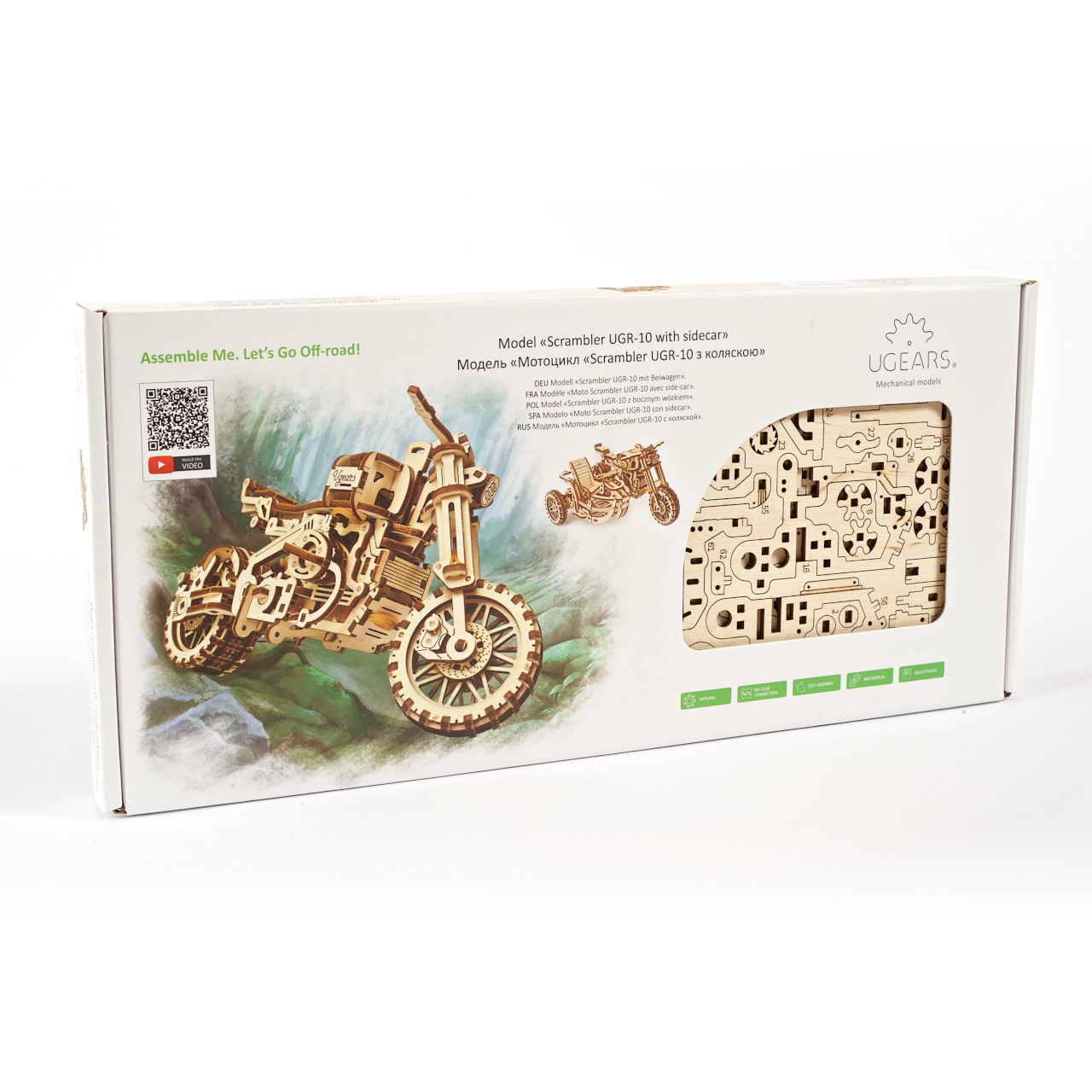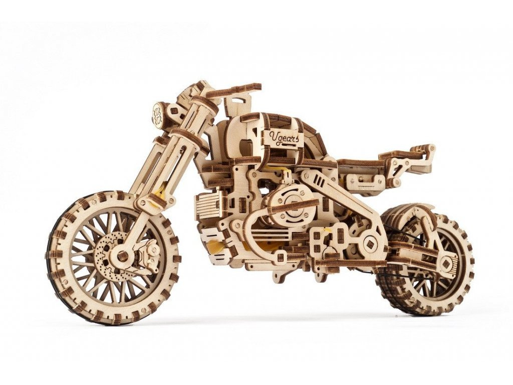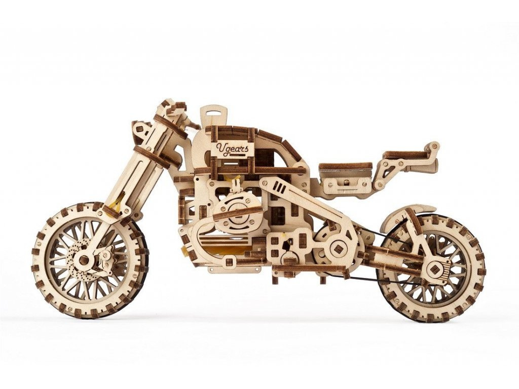 Vydejte se cestou necestou. Stavebnice motorky typu scrambler se sajdkárou vyrobená z překližky. Model je realisticky vybaven stojanem a stroj si tak můžete vystavit zvlášť i bez vozíku. Mechanika je do detailu propracovaná, a vy tak můžete pozorovat pohyb pístů motoru. Motorka je řiditelná a díky natahovacímu mechanismu je schopna jízdy, na jedno natažení urazí až 3 m. Natahuje a spouští se zvlášť určenými klíči. Jízdní dynamice slouží odpružení obou vidlic. Uspořádejte závody s dalšími modely UGEARS! Vybaveno detailním návodem k sestavení.