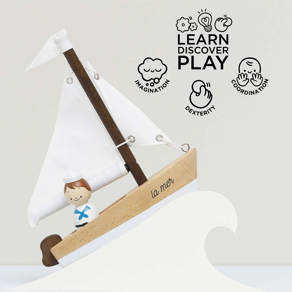 Vyplujte na širé moře a objevujte nová dobrodružství s touto nádhernou plachetnicí, která září nadčasovým kouzlem. Dřevěná plachetnice je ručně vyrobená z bukového dřeva s certifikací FSC ®, některé části jsou mořeny v barvě ořechu, přináší tak nádech autentičnosti. Dekorováno netoxickými barvami na bázi vody, které jsou bezpečné pro děti. Bavlněná vlajka a plachty se lehce vlní ve větru a pohánějí loď k nekonečným obzorům, což zvyšuje nápaditou hrací hodnotu této hračky. Loď doprovází miniaturní dřevěný námořník, který má ručně malovaný námořnický oděv, díky tomu se hra s touto plachetnicí se stává ještě zábavnější. Ať už je loď používána jako dekorativní prvek, nebo jako hračka, okamžitě poutá pozornost každého dítěte. Pomáhá rozvíjet kognitivní dovednosti, zručnost a koordinaci ruka - oko.