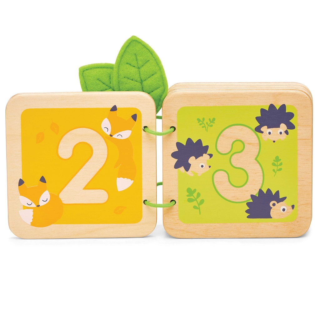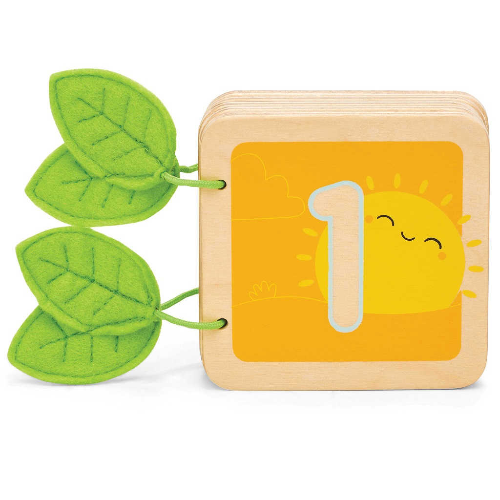 Děti se s touto pěknou dřevěnou knížkou naučí počítat, je to perfektní hračka, která malé děti zaujme a zabaví. Má roztomilé ilustrace, díky kterým se děti naučí počítat od 1 do 10. Každá stránka je v jiné tematice, v knize najdete včelky, kuřátka, berušky… Hračka děti podpoří v rozvoji řeči a rozpoznávání čísel. Je vyrobena z odolného a udržitelného kaučukového dřeva, malována barvami na bázi vody, vázání je z ručně šitých plstěných lístků.
