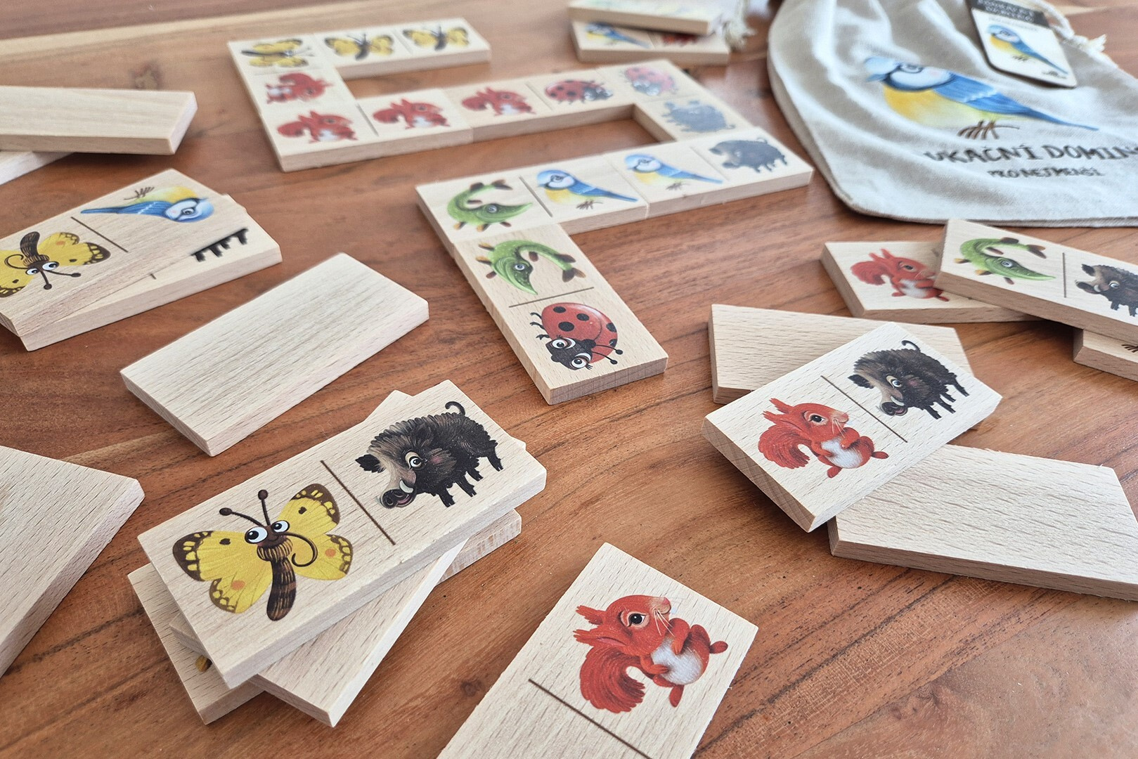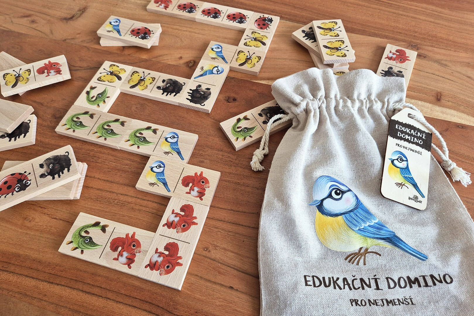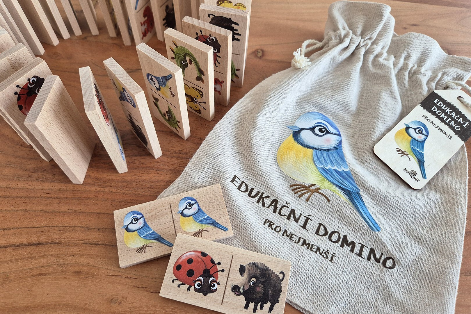 Domino je vyrobeno v České republice z kvalitního certifikovaného dřeva a uloženo v praktickém přírodním pytlíku. Obrázky pocházejí od českých ilustrátorů a jsou chráněny autorským právem.