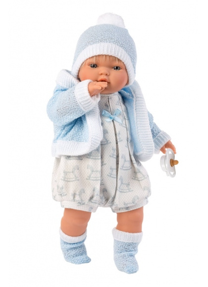 Mluvící panenka s měkkým látkovým tělem a s vlásky po celé hlavě. Po vytažení dudlíku z úst začne panenka říkat „mama“, „papa“ a vydávat reálný zvuk plačícího miminka. Panenku lze utišit dudlíkem. Velikost 33 cm. Součástí balení je 3 x knoflíková baterie LR44.