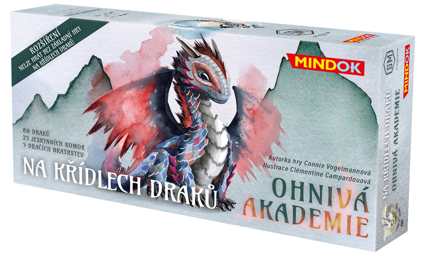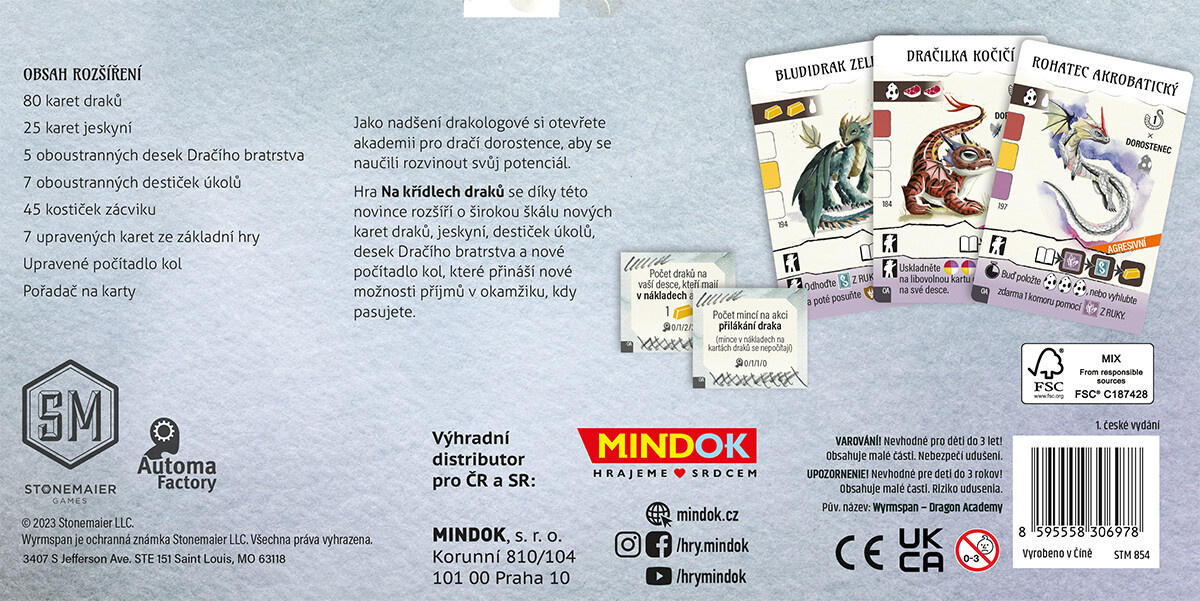 Staňte se drakologem a vybudujte akademii pro dračí dorostence! Rozšíření Ohnivá akademie přináší do oblíbené hry Na křídlech draků novou vrstvu strategického plánování a obsahu. Jako nadšení drakologové si otevřete akademii, kde dračí dorostenci rozvinou svůj potenciál. Toto kompetitivní rozšíření je určeno pro 1 až 5 hráčů, s herní dobou 90 minut a je vhodné od 14 let.