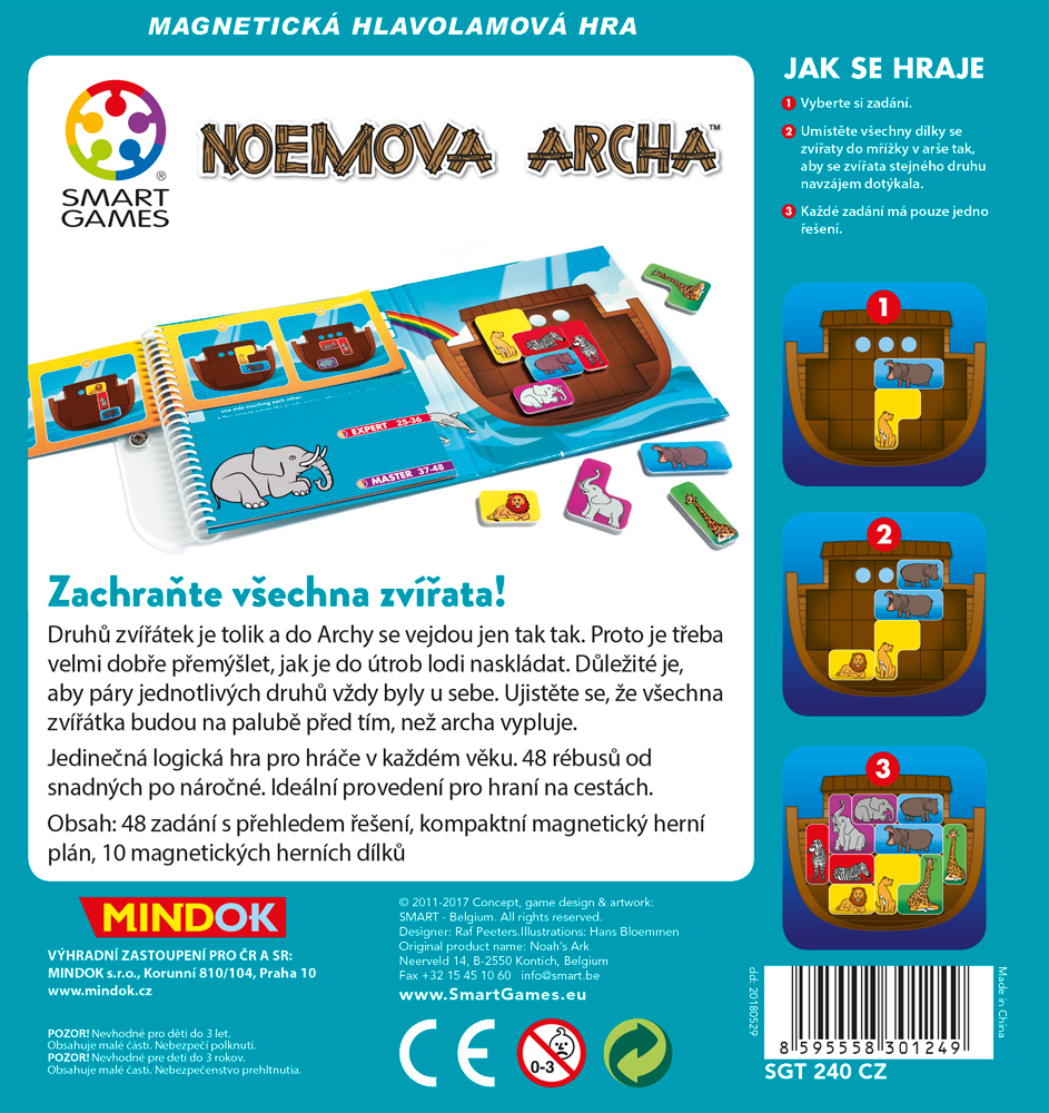 Hlavolamová hra ze série magnetických cestovních her z řady SMART games. Druhů zvířátek je tolik a do Archy se vejdou jen tak tak. Proto je třeba velmi dobře přemýšlet, jak je do útrob lodi naskládat. Důležité je, aby páry jednotlivých druhů vždy byly u sebe. Ujistěte se, že všechna zvířátka budou na palubě před tím, než archa vypluje.
