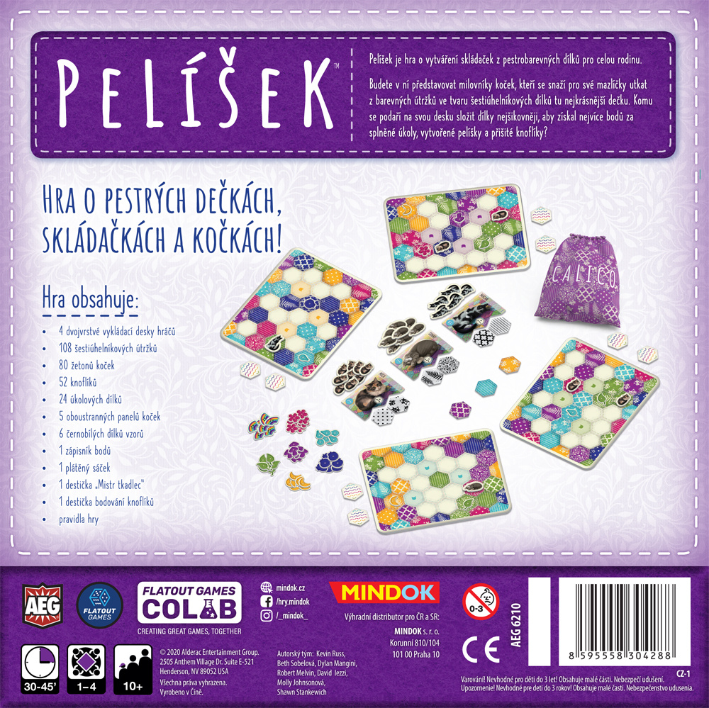Pelíšek je hra o vytváření skládaček z pestrobarevných dílků pro celou rodinu. Budete v ní představovat milovníky koček, kteří se snaží pro své mazlíčky utkat z barevných útržků ve tvaru šestiúhelníkových dílků tu nejkrásnější dečku. Komu se podaří na svou desku složit dílky nejšikovněji, aby získal nejvíce bodů za splněné úkoly, vytvořené pelíšky a přišité knoflíky?